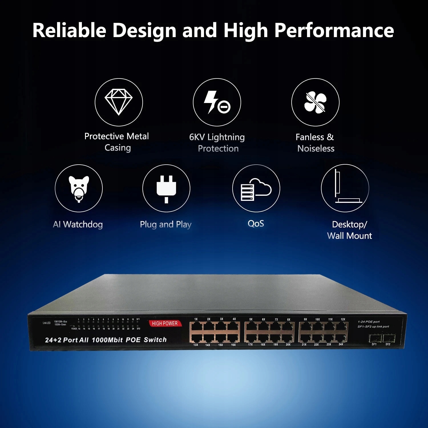 ◆ 24* 10/100/1000M портів PoE + 2* Gigabit Порти SFP Uplink;