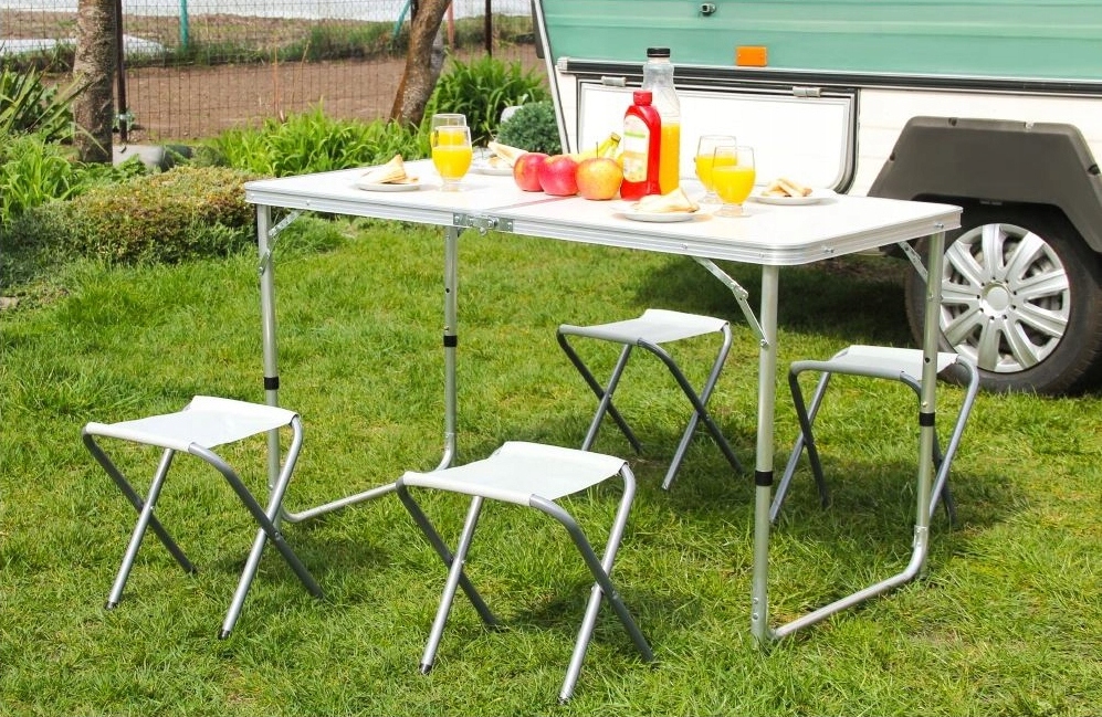 Туристичний стіл із чотирма стільцями — ідеальна пропозиція для людей, які цінують комфорт і мобільність. Дуже проста і легка алюмінієва конструкція дозволяє легко складати стіл у будь-якому місці. Якщо ви цінуєте комфорт, пов’язаний з мобільністю під час подорожі, цей стіл стане ідеальною пропозицією. Ви можете взяти його з собою в сімейну подорож, на пікнік або використовувати в усамітненні свого саду.
