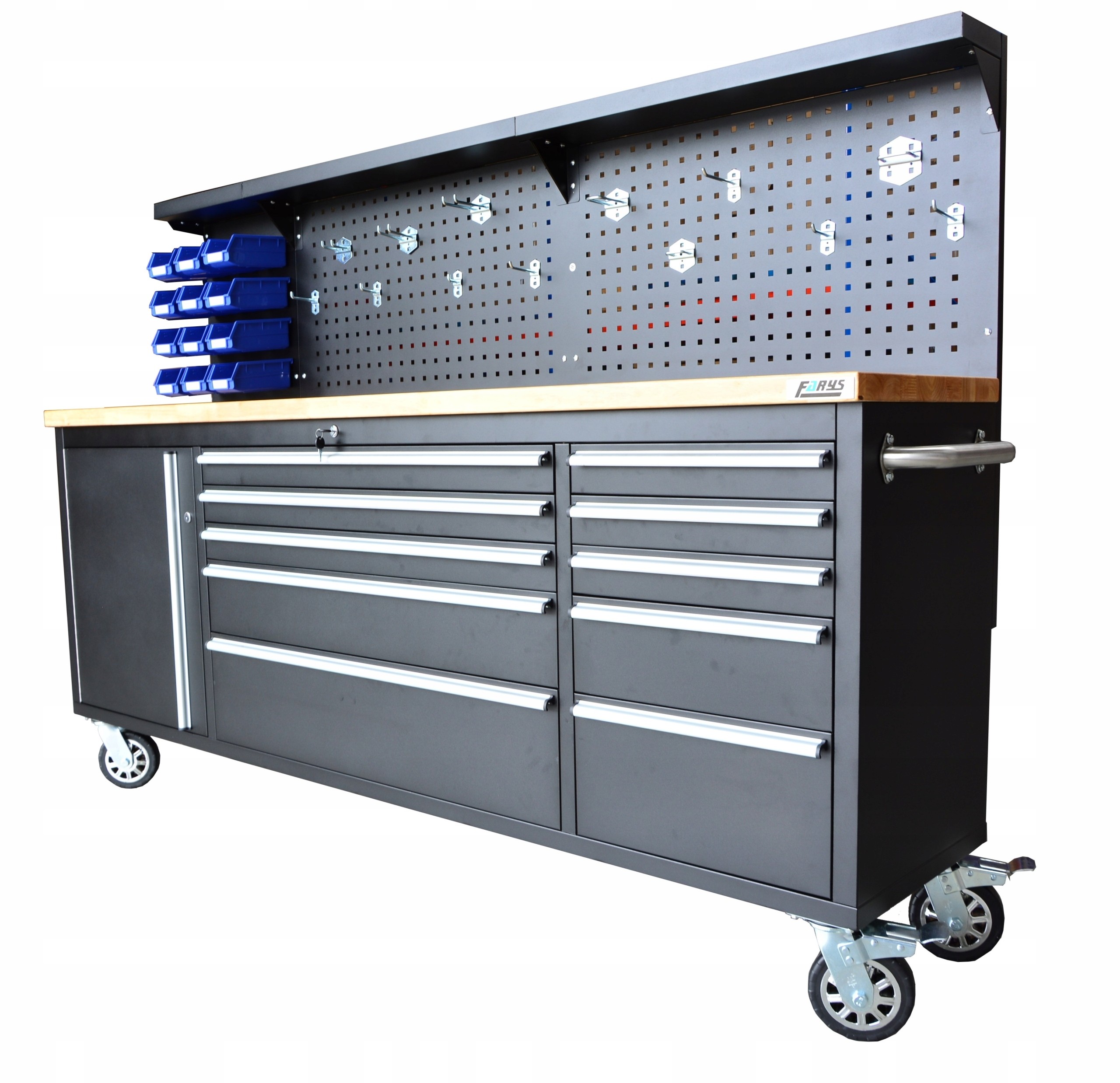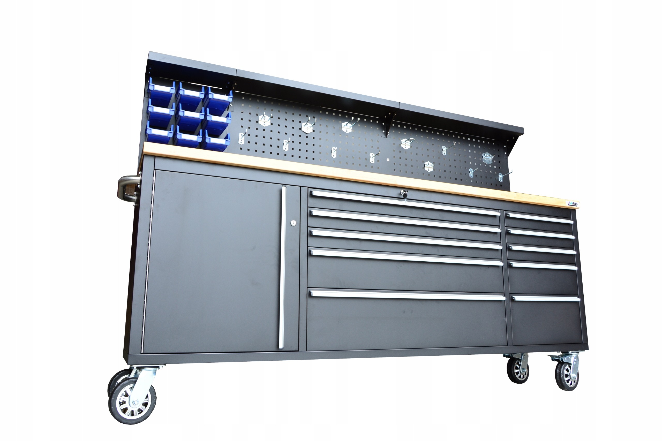 Ви можете не тільки розмістити всі свої інструменти в одному відсортованому місці, але й матимете до них легкий доступ. Обладнання встановлено на чотирьох колесах, тому великий верстак з дерев'яною стільницею можна без проблем транспортувати в різні місця. Якщо ви хочете розширити свій домашній DIY обладнання професійним обладнанням за вигідною ціною, наша пропозиція, безсумнівно, вас задовольнить.