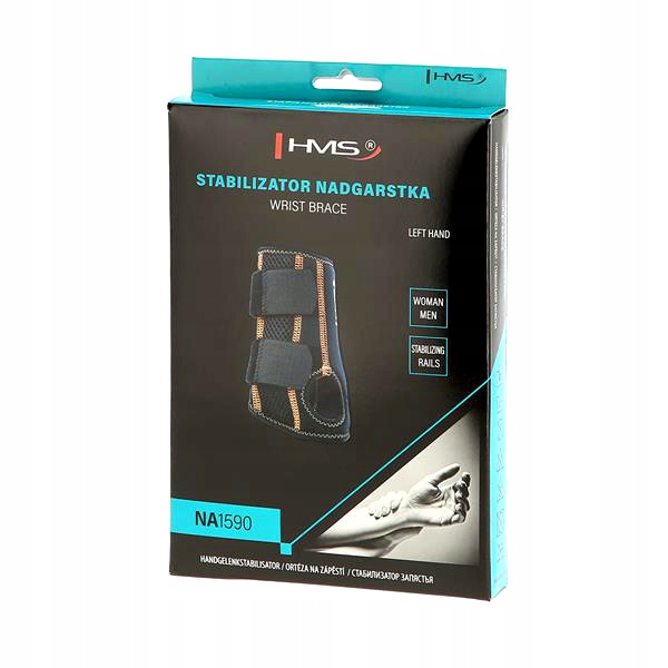 NA1590 HMS — це стабілізатор зап'ястя. Він був розроблений, щоб знерухомити зап'ястковий суглоб і підтримувати його в прямому положенні. Алюмінієві шини захищають від тильного та долонного згинання. При цьому, завдяки своїй структурі, вони не обмежують рухи пальців або великого пальця, дозволяючи повний діапазон рухів. Стабілізатор зберігає тепло тіла завдяки стисненню, що призводить до місцевого полегшення болю та запалення.