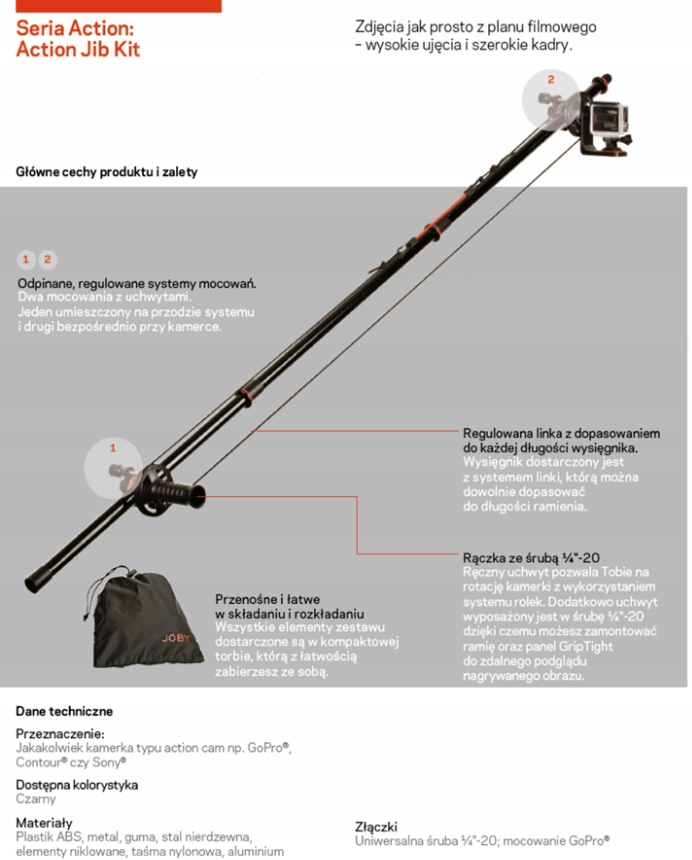 Оригінальний набір JOBY Action Jib Kit дозволяє стабільно знімати динамічні кадри, забезпечуючи ідеальні візуальні ефекти.