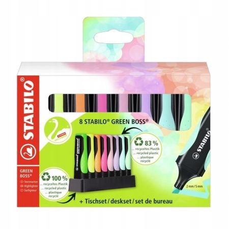 До речі: чи знаєте ви, що Stabilo об'єднав зусилля з Coca-Cola як частину проекту переробки? Пластик "проциклен", отриманий від ковпачків з пляшок кола, використовується для виробництва стабіло -зеленого асортименту Bossa. Цей процес зменшує викиди парникових газів під час виробництва на 50%!