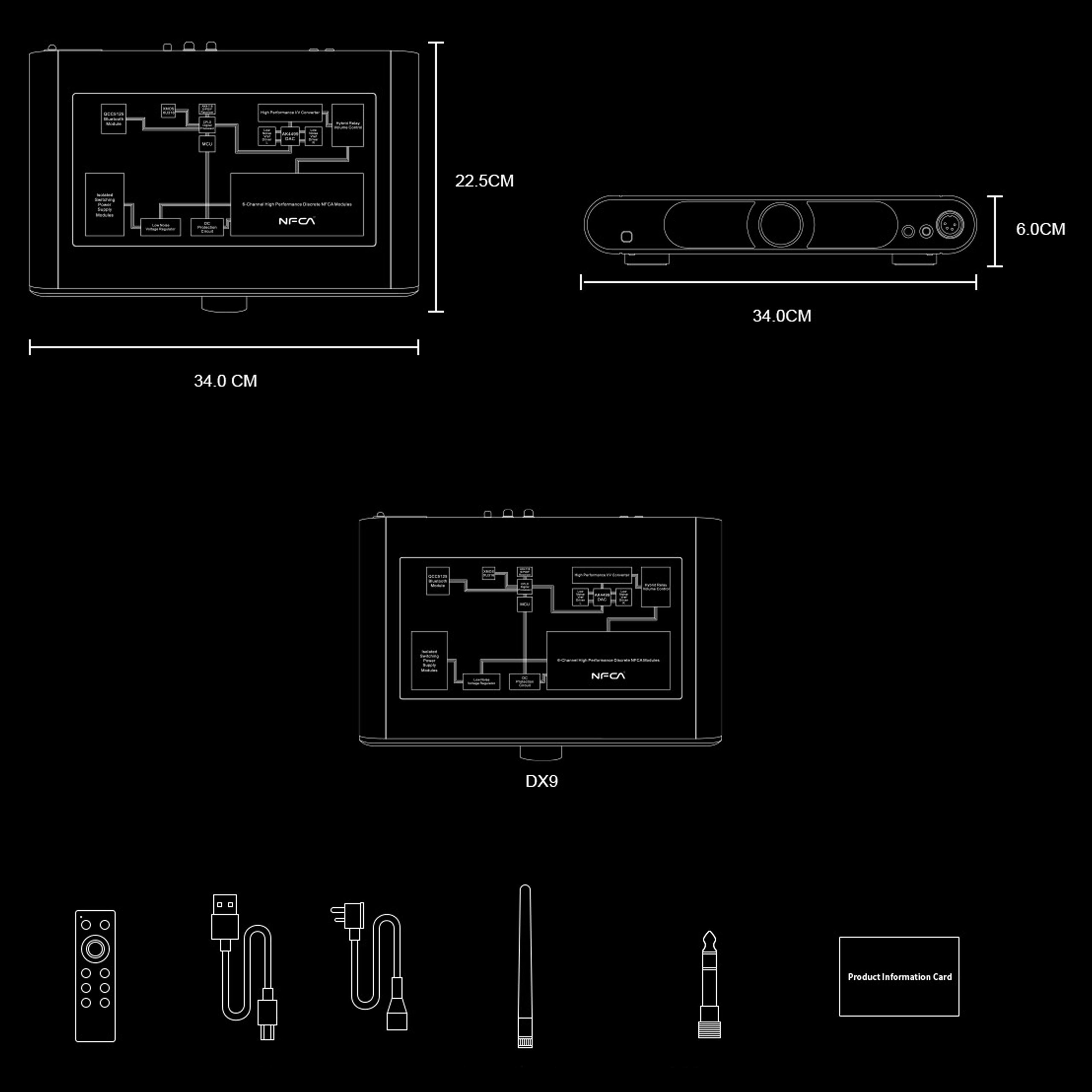 • Аксесуари: адаптер 6,35 мм на 3,5 мм, антена Bluetooth, кабель USB, кабель живлення, інформаційна картка, пульт контроль