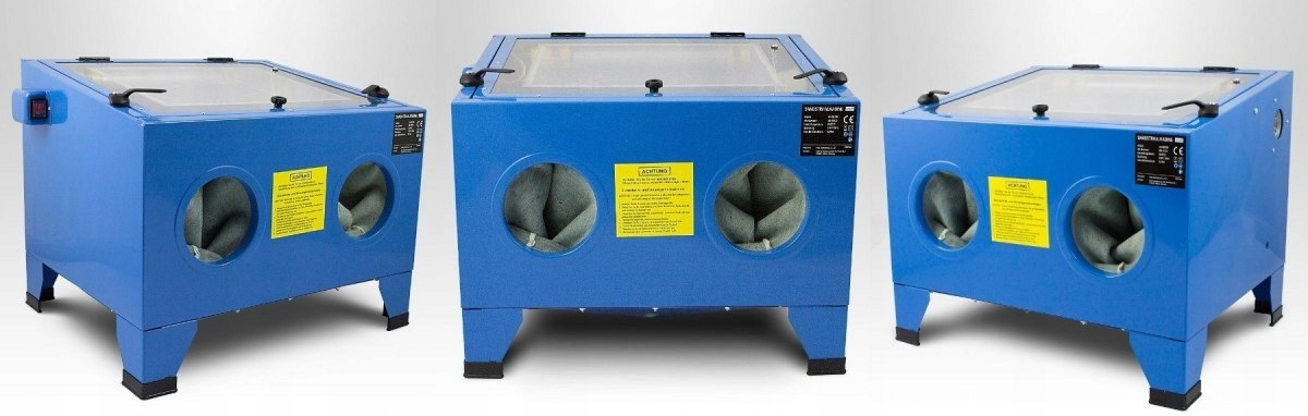 Ефективно очищає, видаляє стару фарбу та іржа з різних предметів. Ідеально підходить для невеликих майстерень. Завдяки кабіні з підсвічуванням на 90 л і змінним плівкам ПВХ (5 фольг в комплекті) працювати легко і приємно. Пістолет, що входить в комплект, має роз'єм 3/8 дюйма і 4 змінні насадки (кожна для різного виду робіт). Для роботи пістолет має бути підключений до компресора.