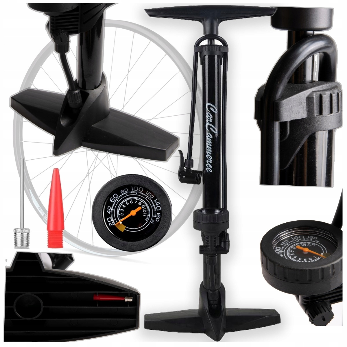 Насос містить різні наконечники, тому насос можна використовувати для велосипедів, автомобілів, мотоциклів, м'ячів, повітряних кульок тощо. Наконечник адаптований до різних типів клапанів! (AV, FV, DV). До насоса входить адаптер для накачування матраців і кулькова голка (розміщується в підставці)