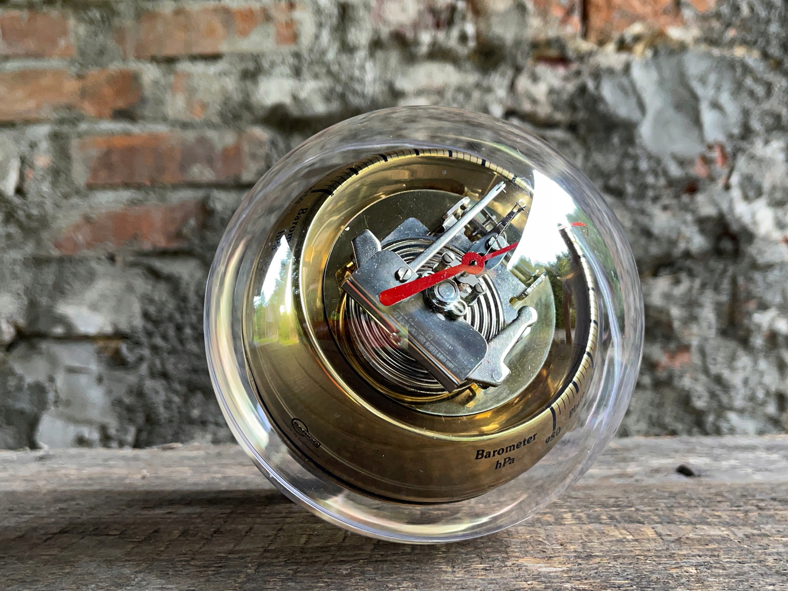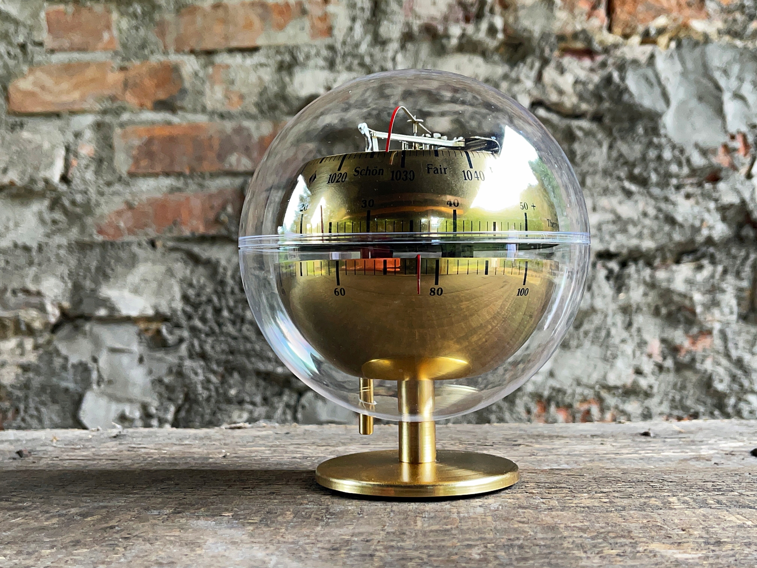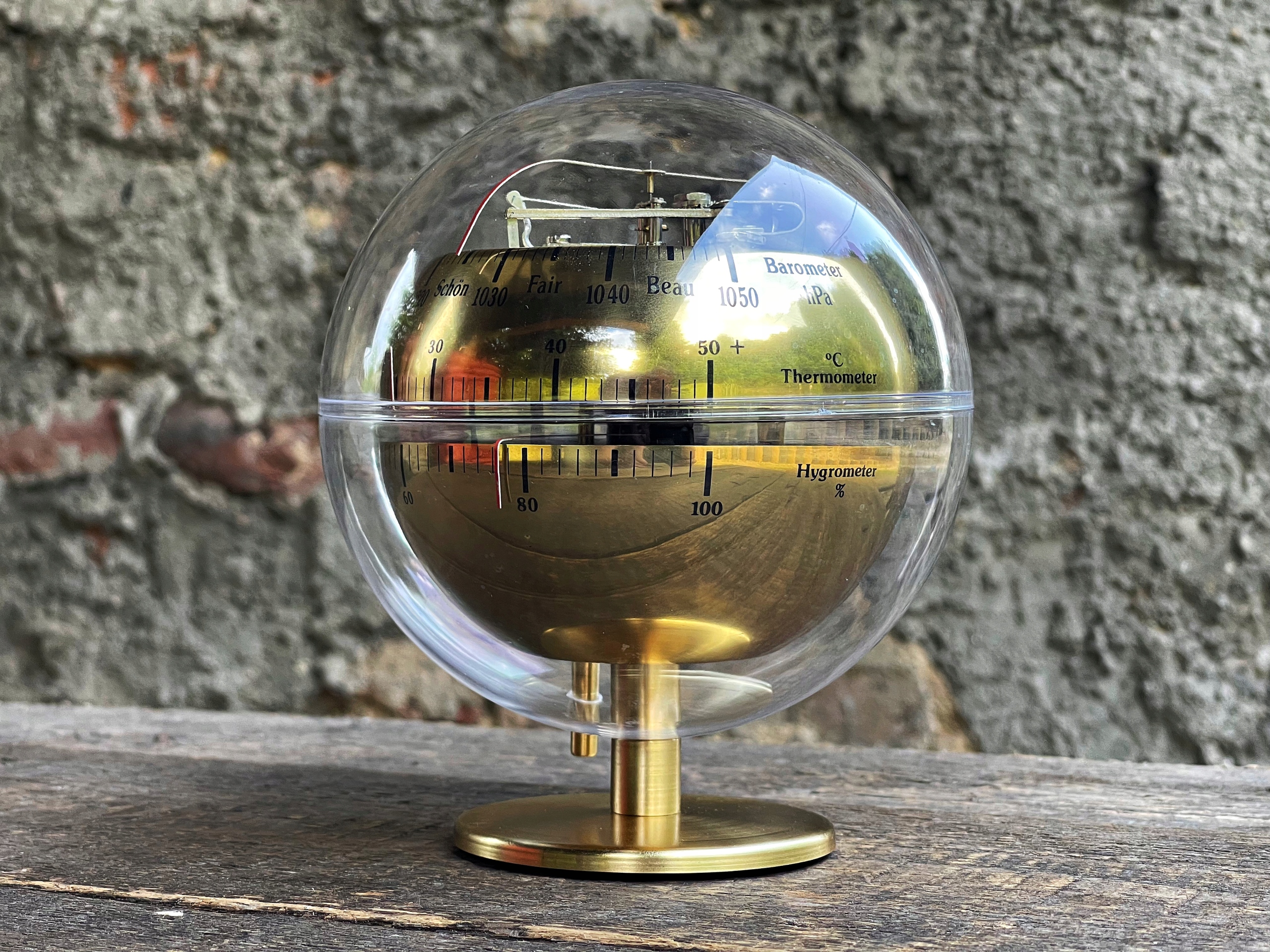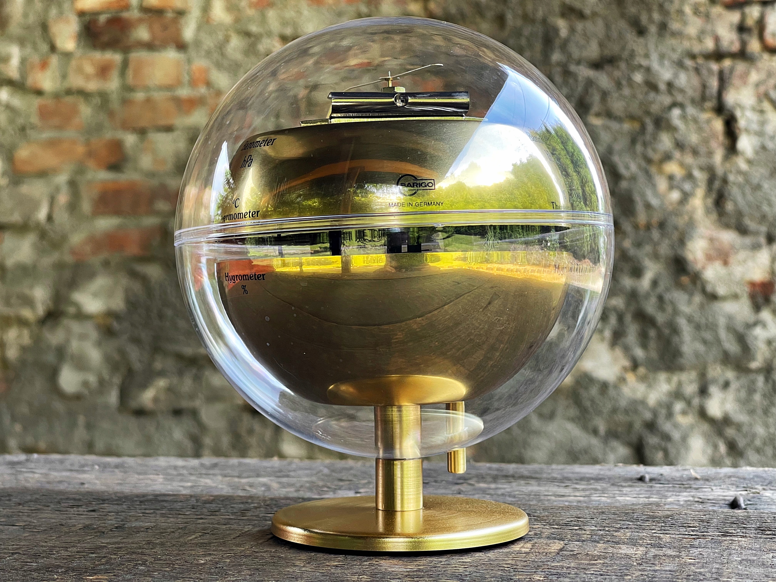 метеостанція "Баріго" в старовинній атмосфері з 1970-х років з барометром, термометром, гігрометром, інтегрованим у корпус у формі кулі Plaxiglas. Барометр використовується для вимірювання атмосферного тиску і масштабується в гектотопаскосах, термометрі в ступенях Цельсія та Фаренгейта та гігрометра в відсотках. Дуже декоративна метеостанція, безумовно, приверне увагу багатьох членів домогосподарств. Висота - 19 см, діаметр кулі -14 см .. можливість вийти з договору до 14 днів.