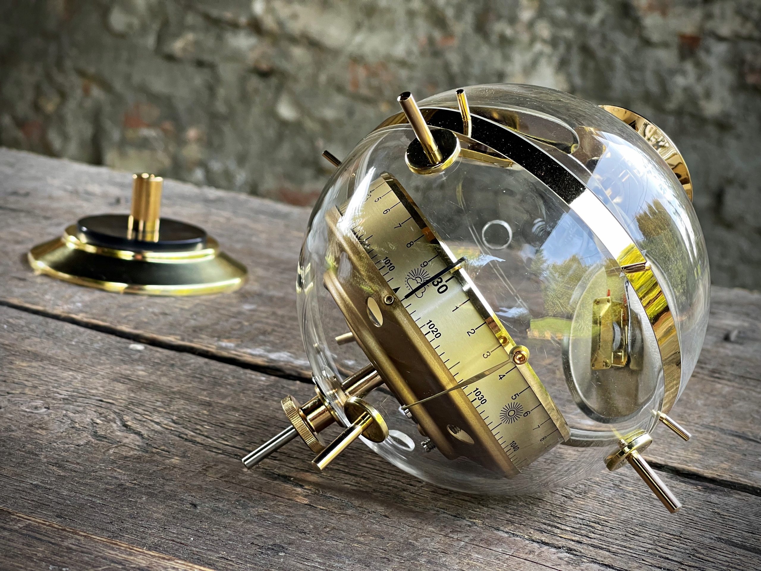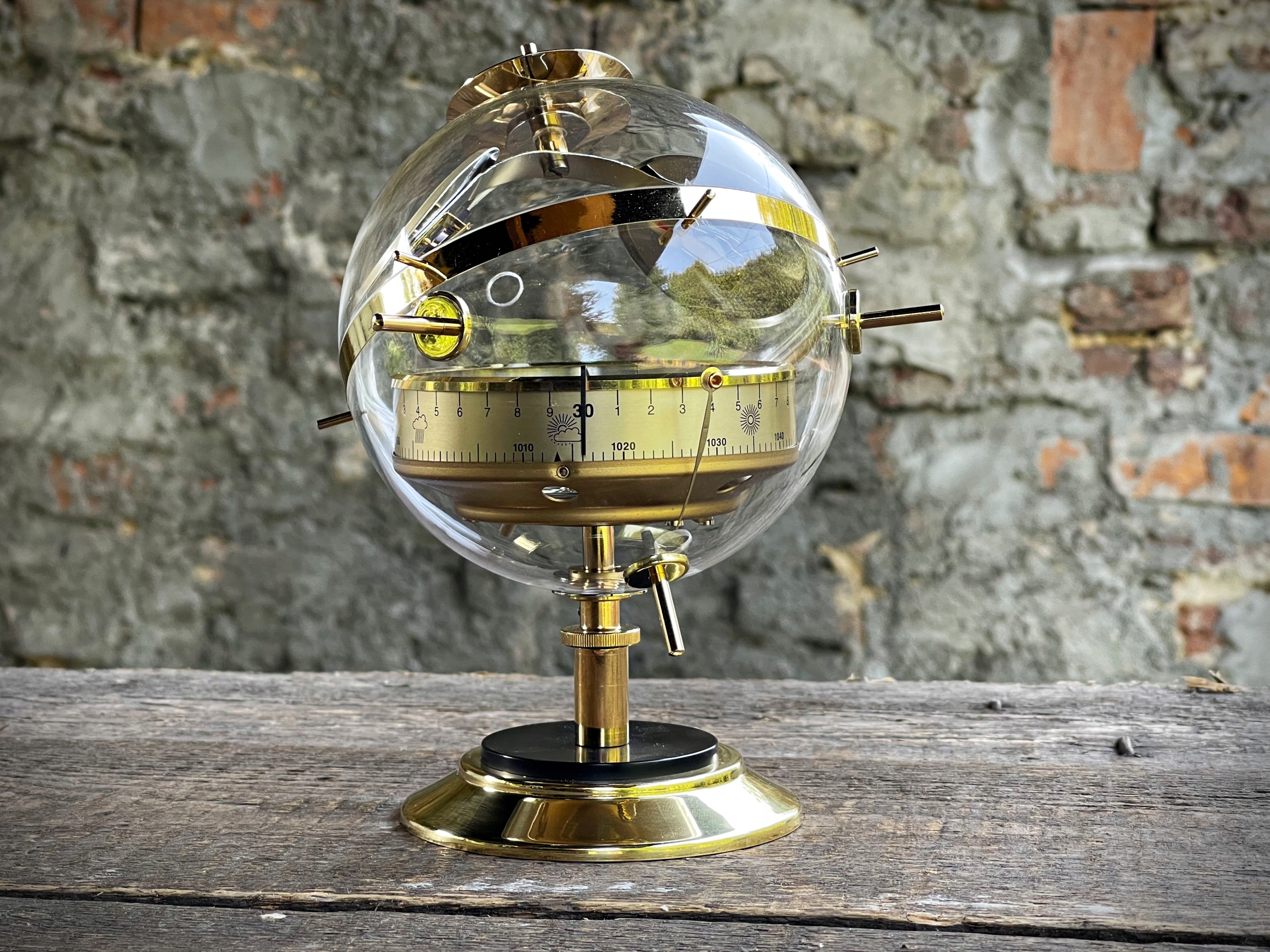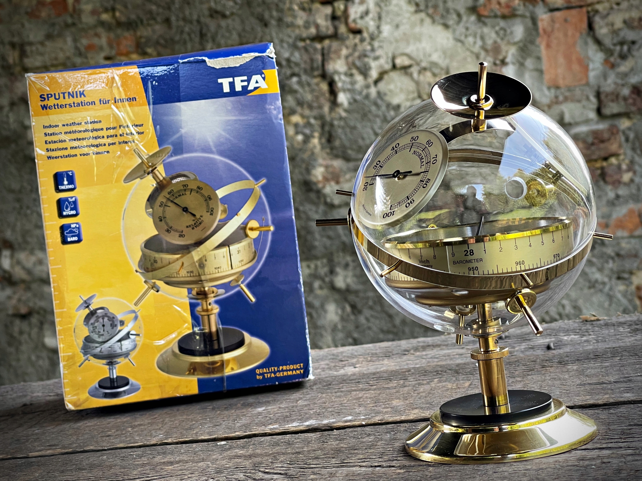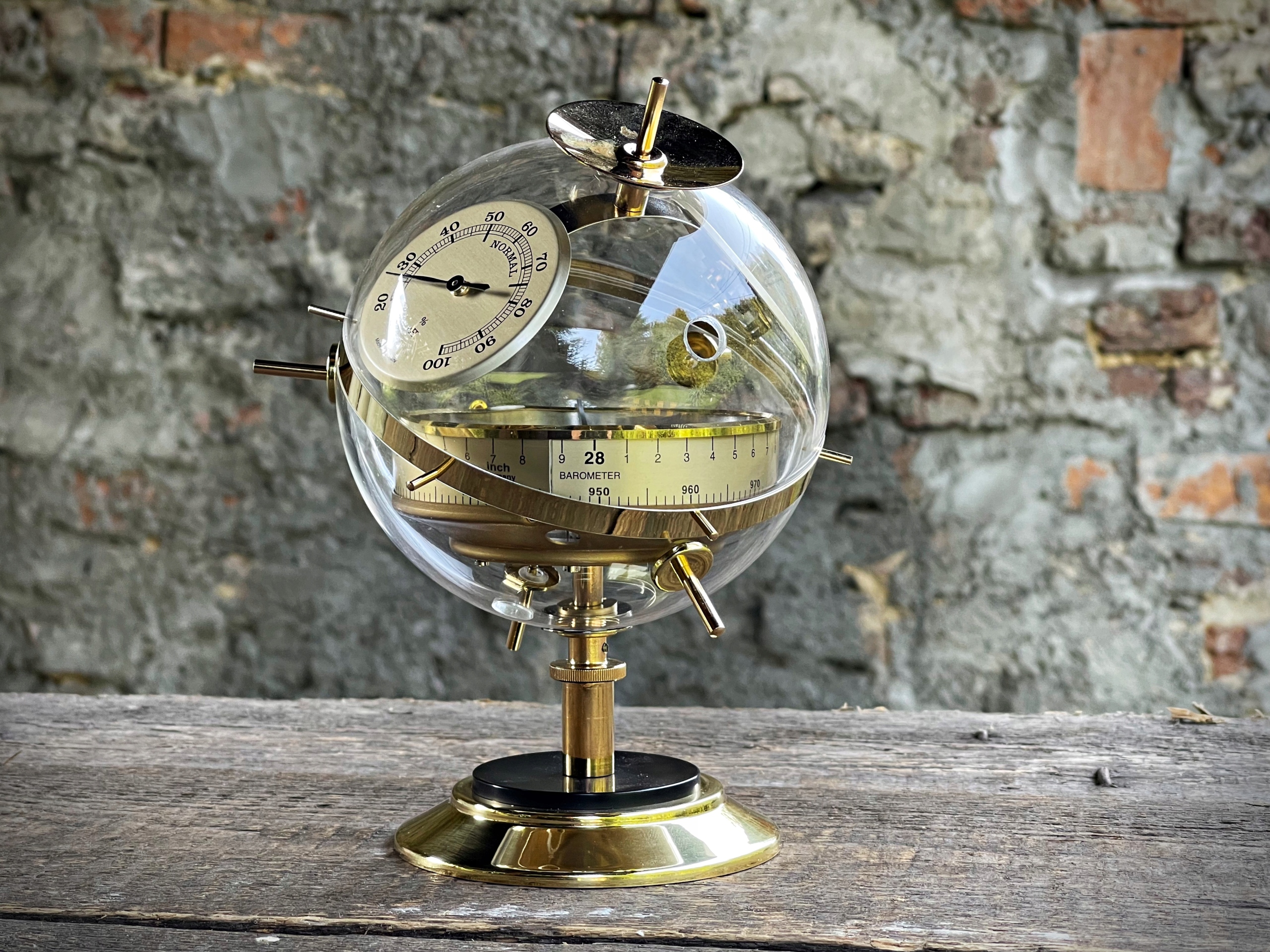 Метеостанція "Супутник" з барометром, термометром і гігрометром, вбудованими в кулястий корпус з оргскла з латунними вставками. Товар не використовувався, так званий лежак для зберігання ніколи не виставлявся. Барометр використовується для вимірювання атмосферного тиску та відкалібрований у гектопаскалях, термометр у градусах Цельсія та Фаренгейта, а гігрометр у відсотках. Дуже декоративна метеостанція неодмінно приверне увагу багатьох домочадців. Висота - 19 см, діаметр кулі - 13 см. Можливість відмови від договору протягом 14 днів.