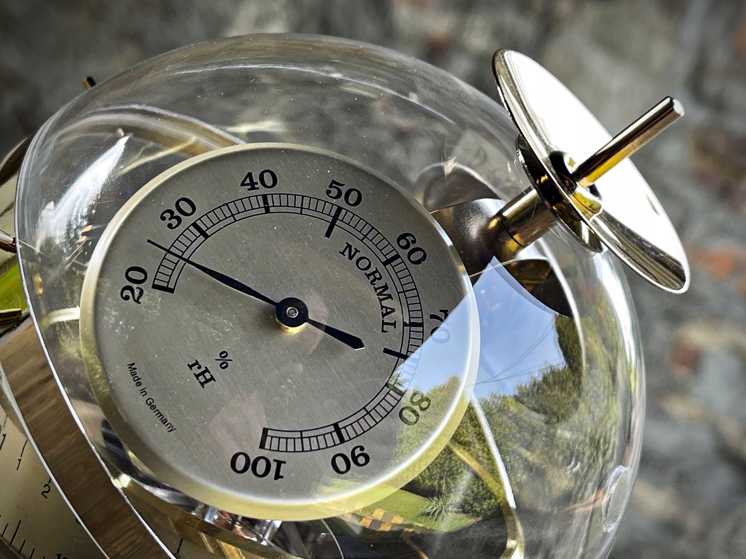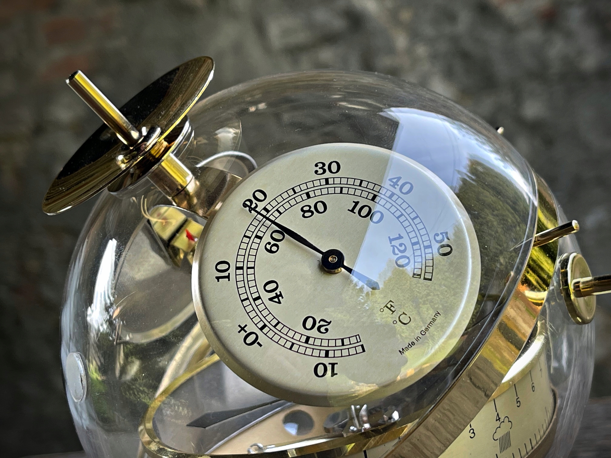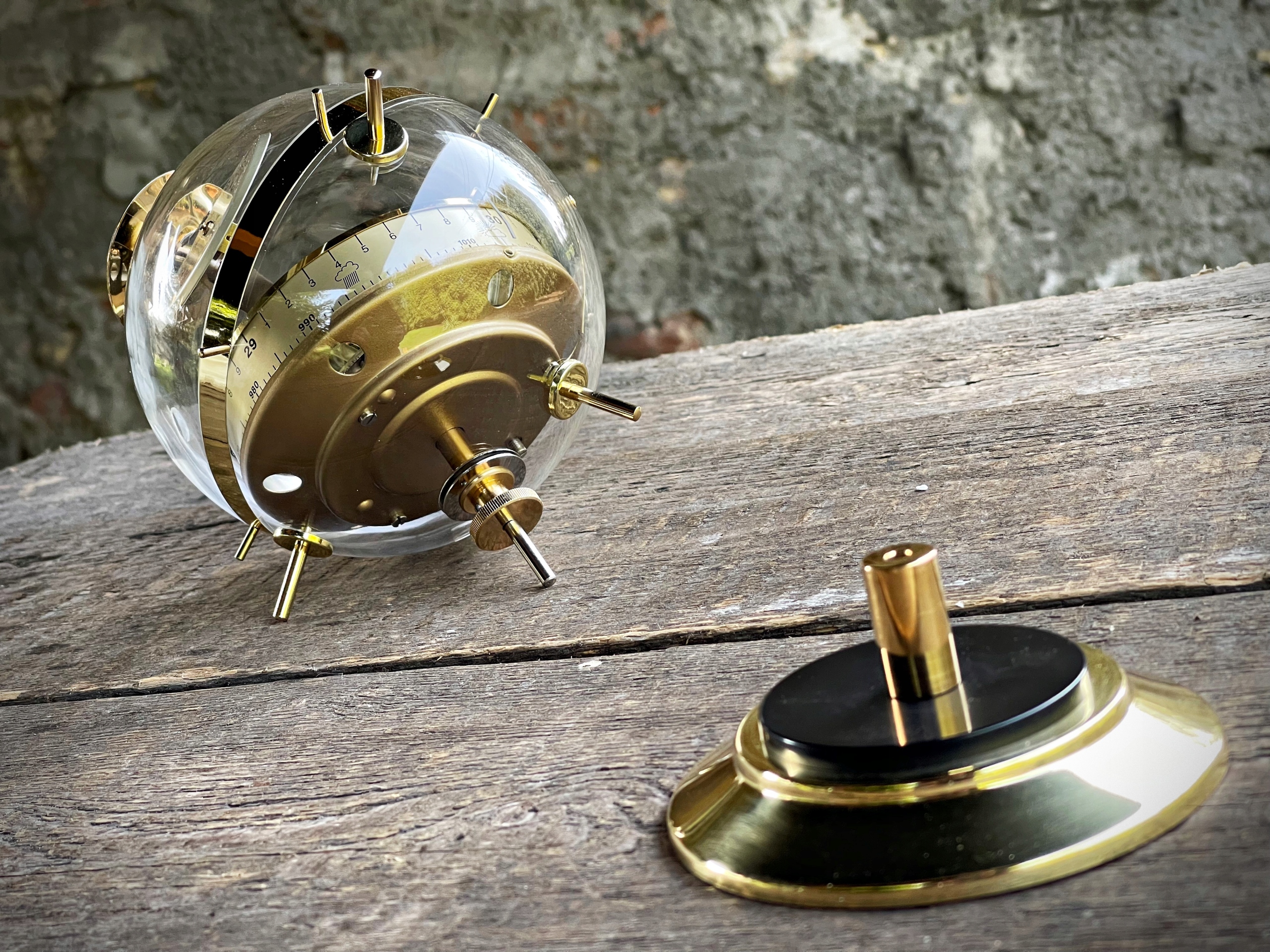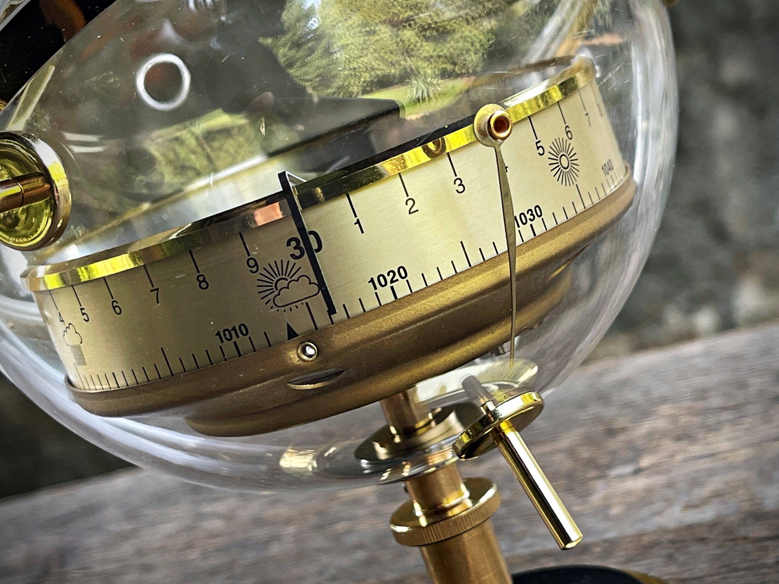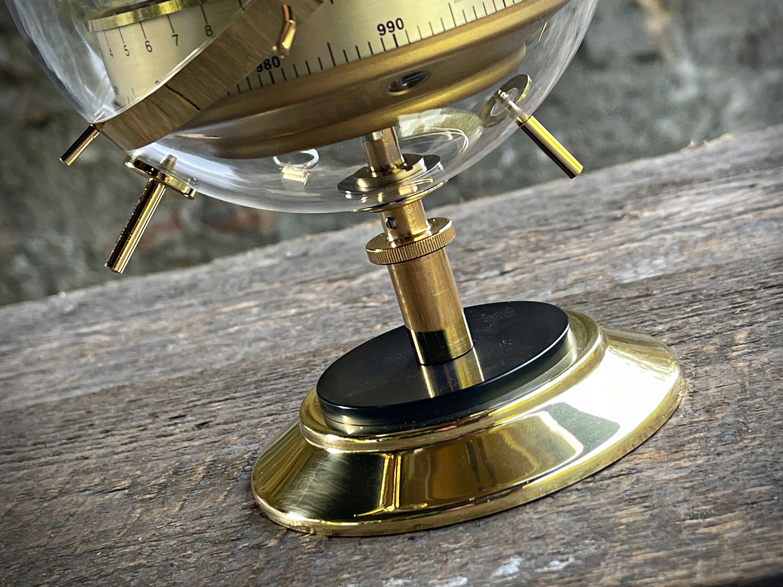 Метеостанція "Супутник" з барометром, термометром і гігрометром, вбудованими в кулястий корпус з оргскла з латунними вставками. Товар не використовувався, так званий лежак для зберігання ніколи не виставлявся. Барометр використовується для вимірювання атмосферного тиску та відкалібрований у гектопаскалях, термометр у градусах Цельсія та Фаренгейта, а гігрометр у відсотках. Дуже декоративна метеостанція неодмінно приверне увагу багатьох домочадців. Висота - 19 см, діаметр кулі - 13 см. Можливість відмови від договору протягом 14 днів.