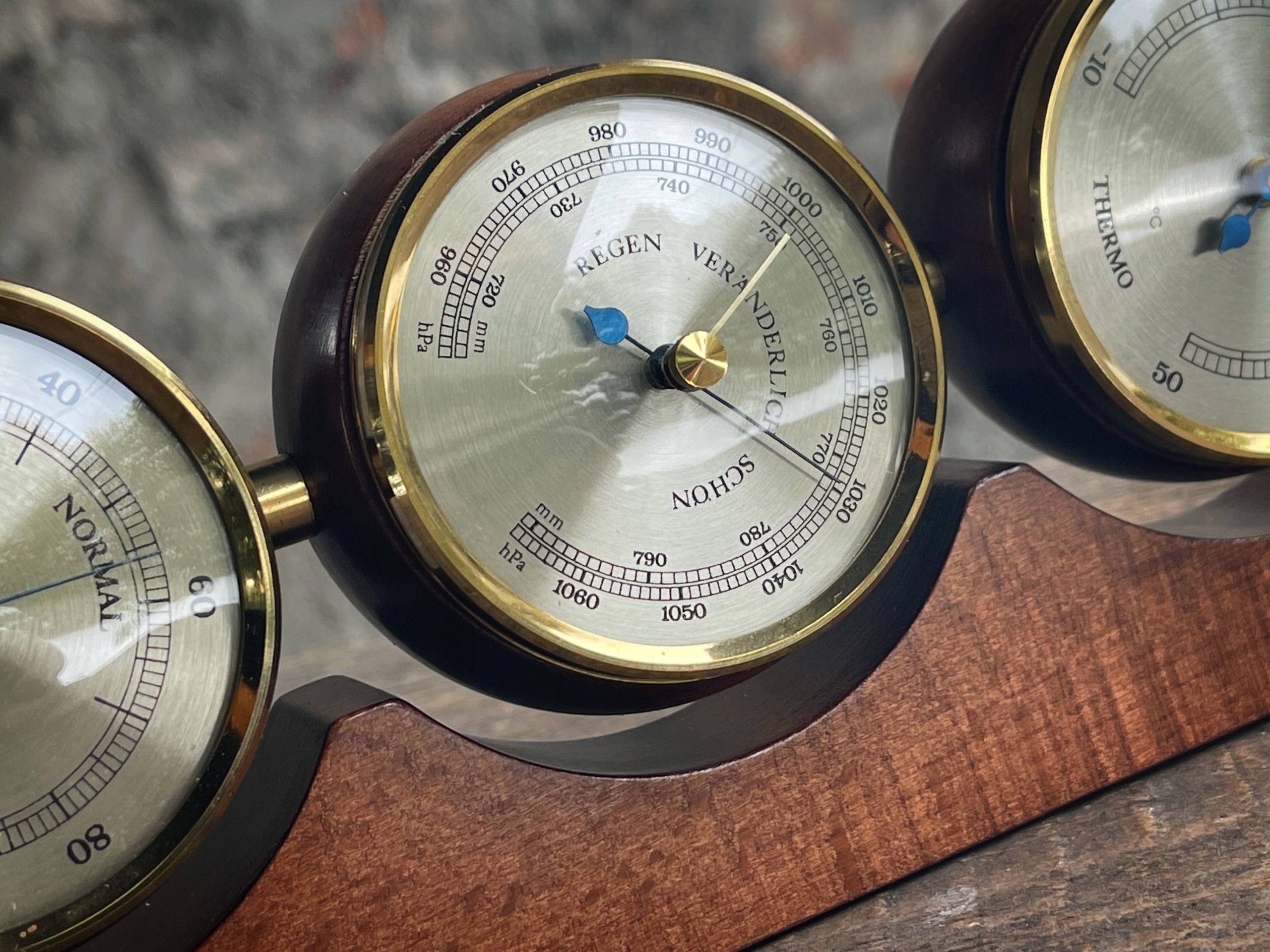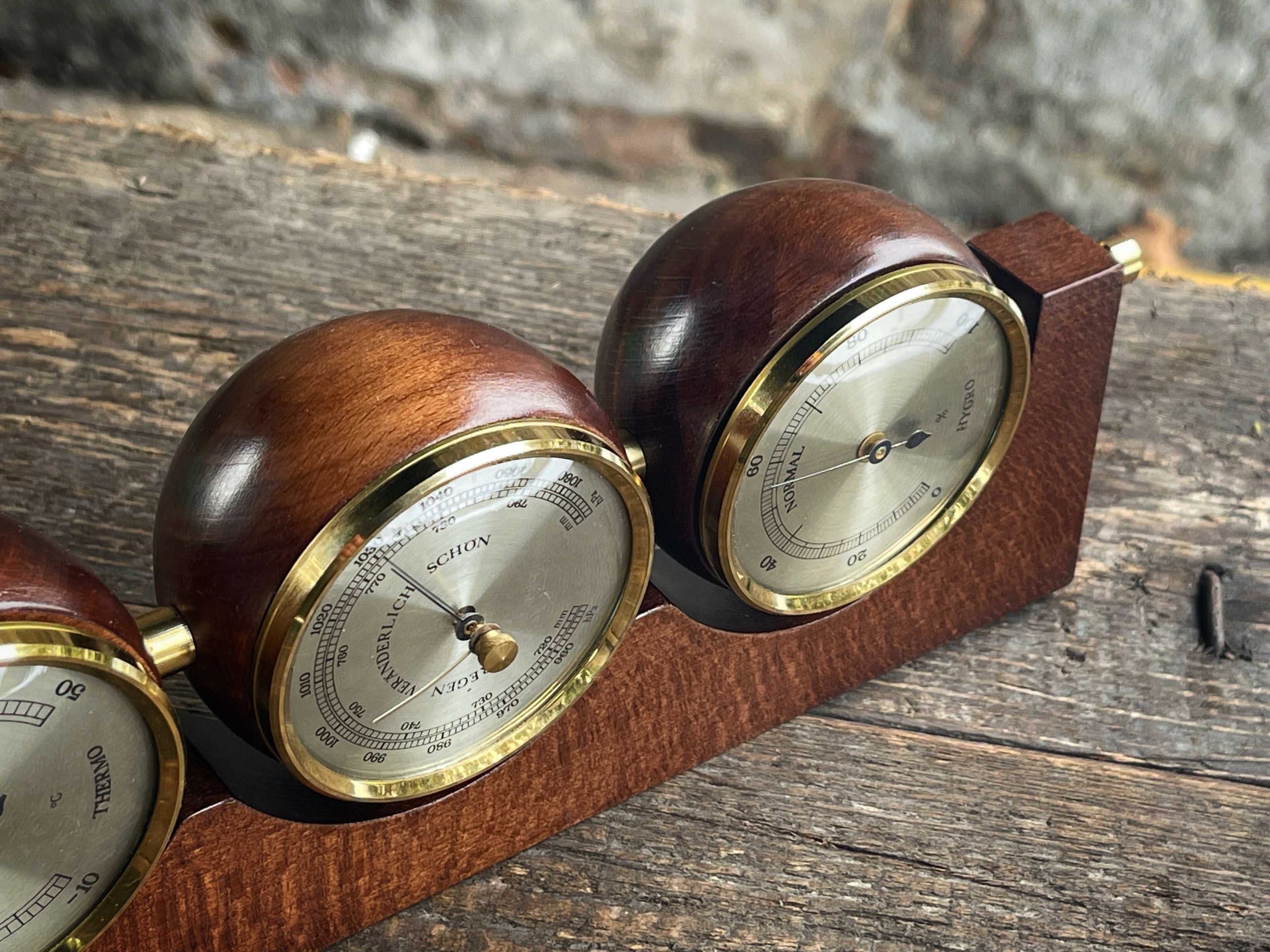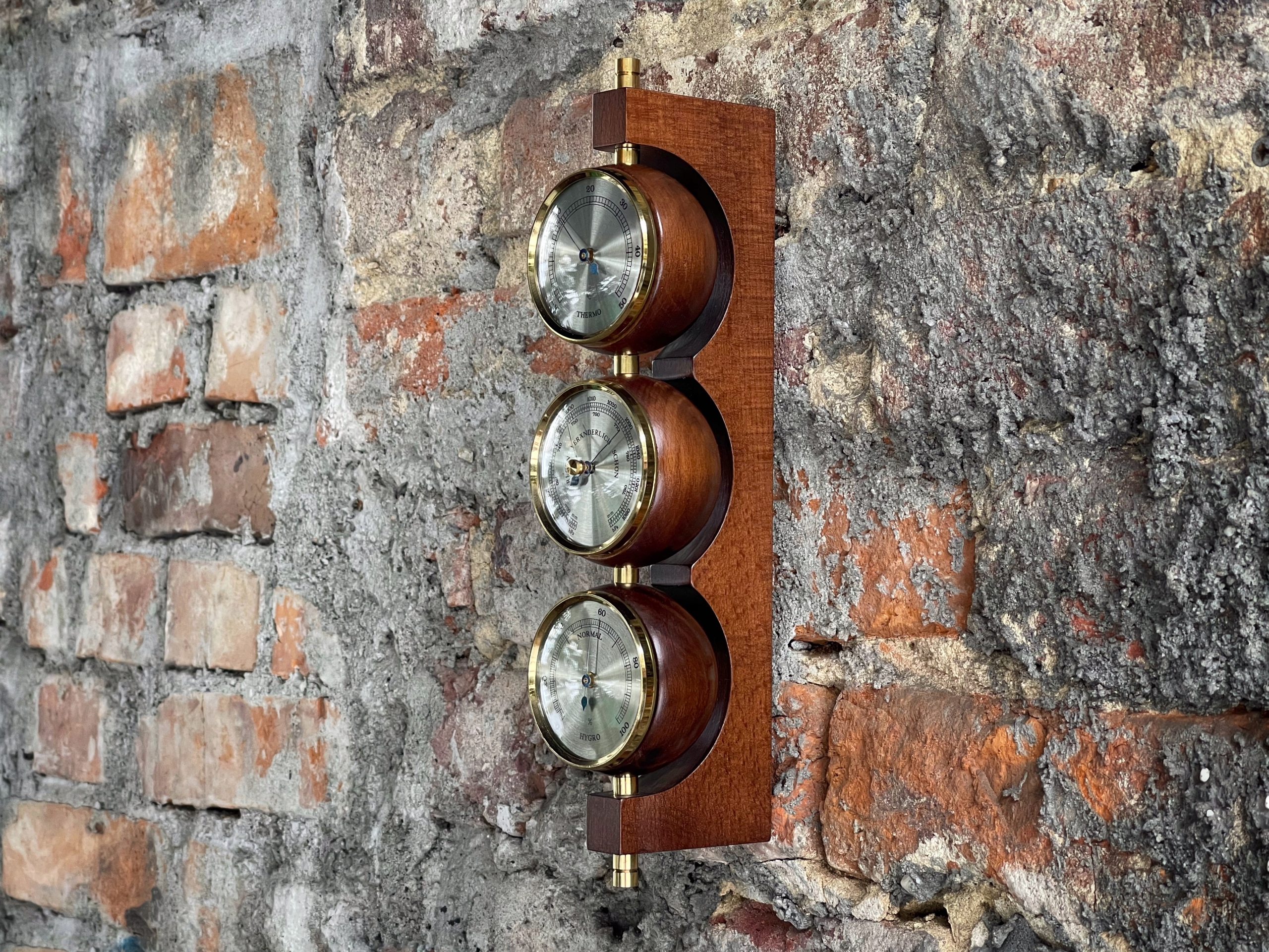 Метеостанція, що складається з барометра, термометра та гігрометра, вбудованих у корпуси у формі дерев’яних куль з латунними вставками. Барометр використовується для вимірювання атмосферного тиску і відкалібрований у гектопаскалях і міліметрах ртутного стовпчика, термометр у градусах Цельсія, а гігрометр у відсотках. Пристрій для підвішування як зовні, так і всередині приміщення. Всі індикатори перевірені та відкалібровані в годинникарській майстерні. Дуже декоративна метеостанція, збережена в ідеальному стані, неодмінно приверне увагу багатьох домочадців. Можливість відмови від договору протягом 14 днів.