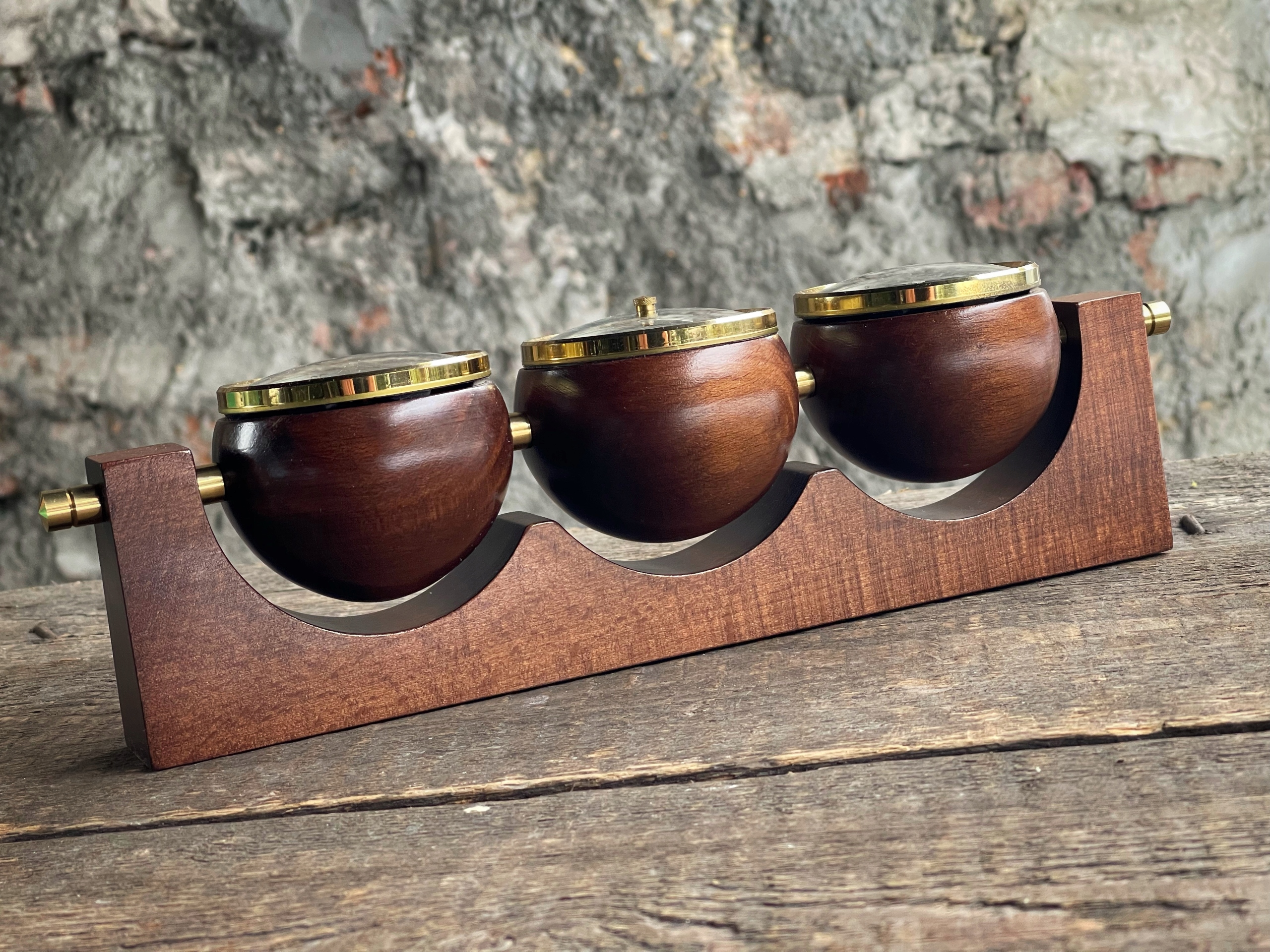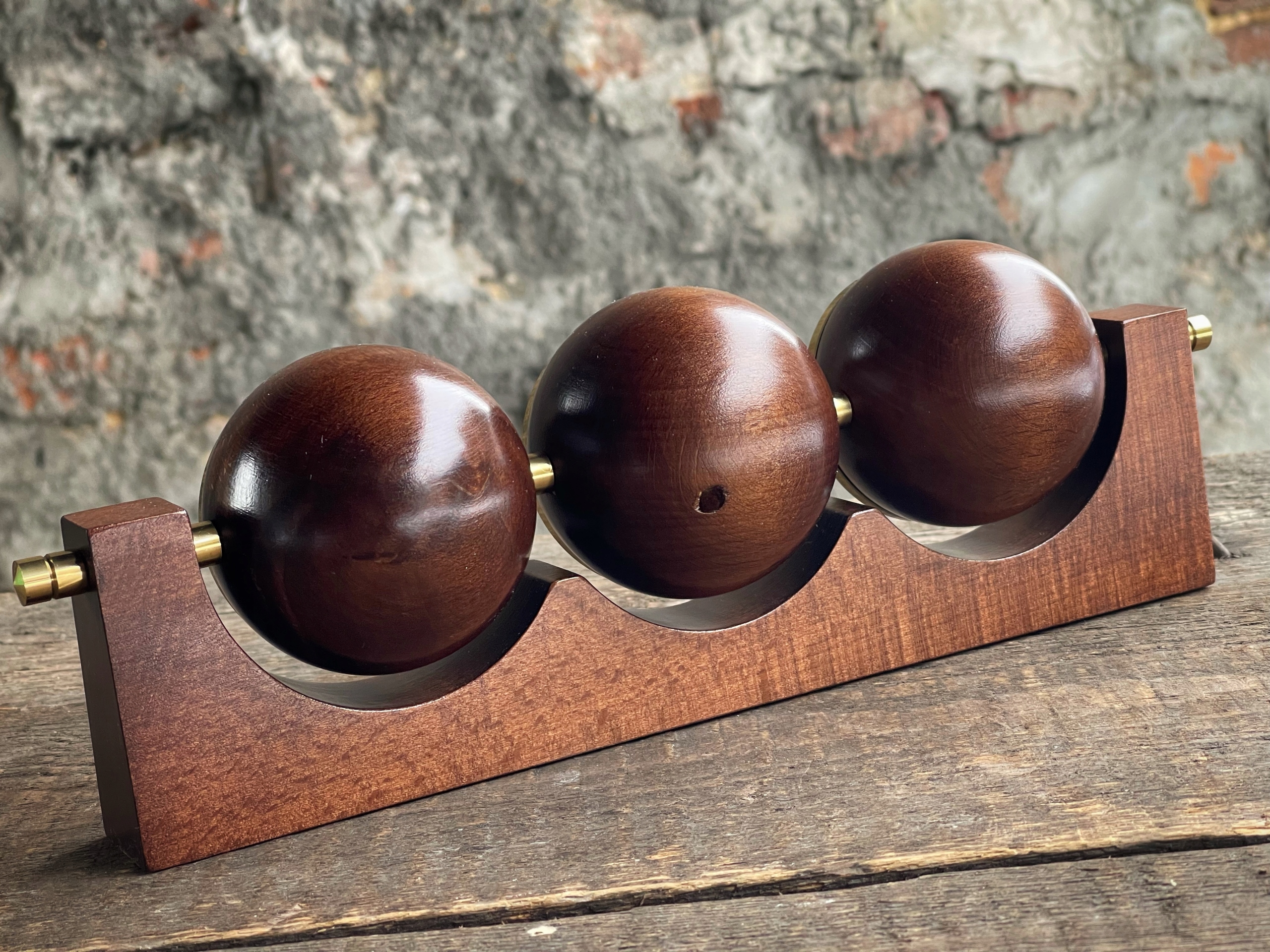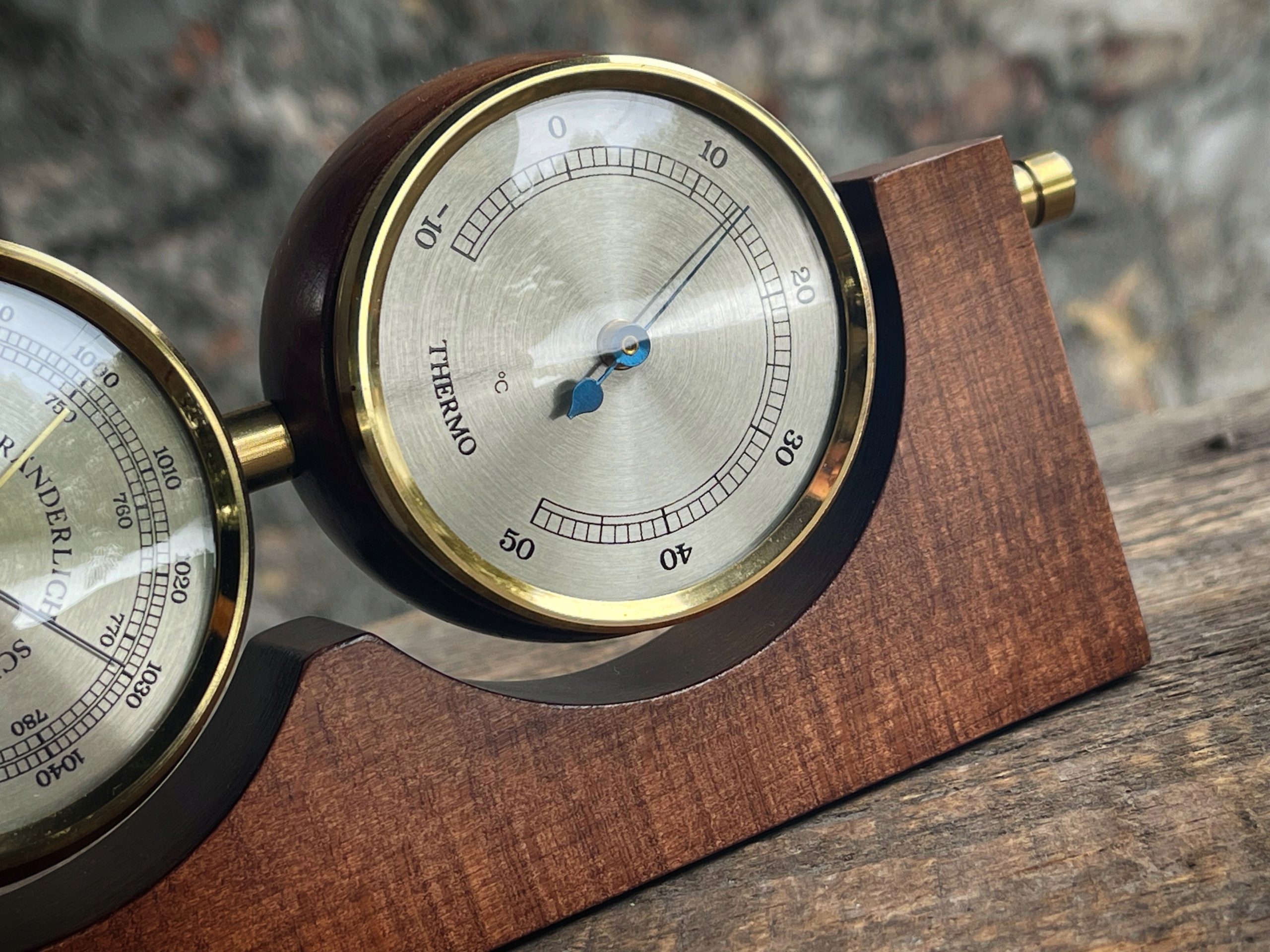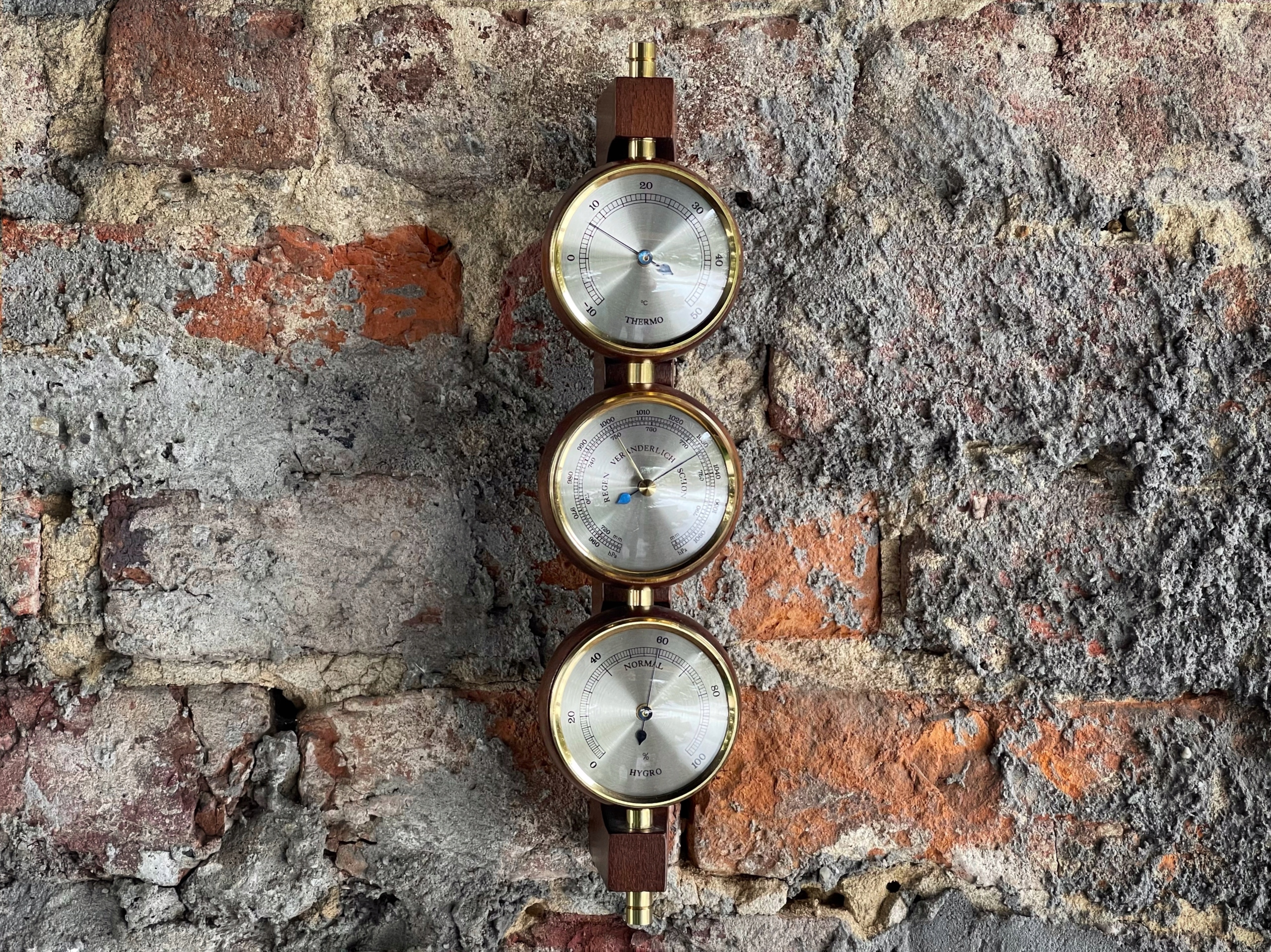 Метеостанція, що складається з барометра, термометра та гігрометра, вбудованих у корпуси у формі дерев’яних куль з латунними вставками. Барометр використовується для вимірювання атмосферного тиску і відкалібрований у гектопаскалях і міліметрах ртутного стовпчика, термометр у градусах Цельсія, а гігрометр у відсотках. Пристрій для підвішування як зовні, так і всередині приміщення. Всі індикатори перевірені та відкалібровані в годинникарській майстерні. Дуже декоративна метеостанція, збережена в ідеальному стані, неодмінно приверне увагу багатьох домочадців. Можливість відмови від договору протягом 14 днів.