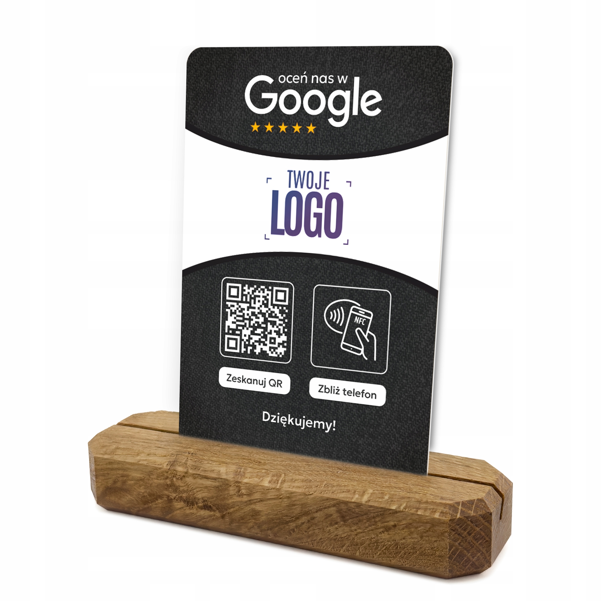 Стаді з тегом NFC та QR -кодом, карткою, стоянням, планшетом, ведучим для збору думок в Google, оцінюйте нас + персоналізація свого логотипу.