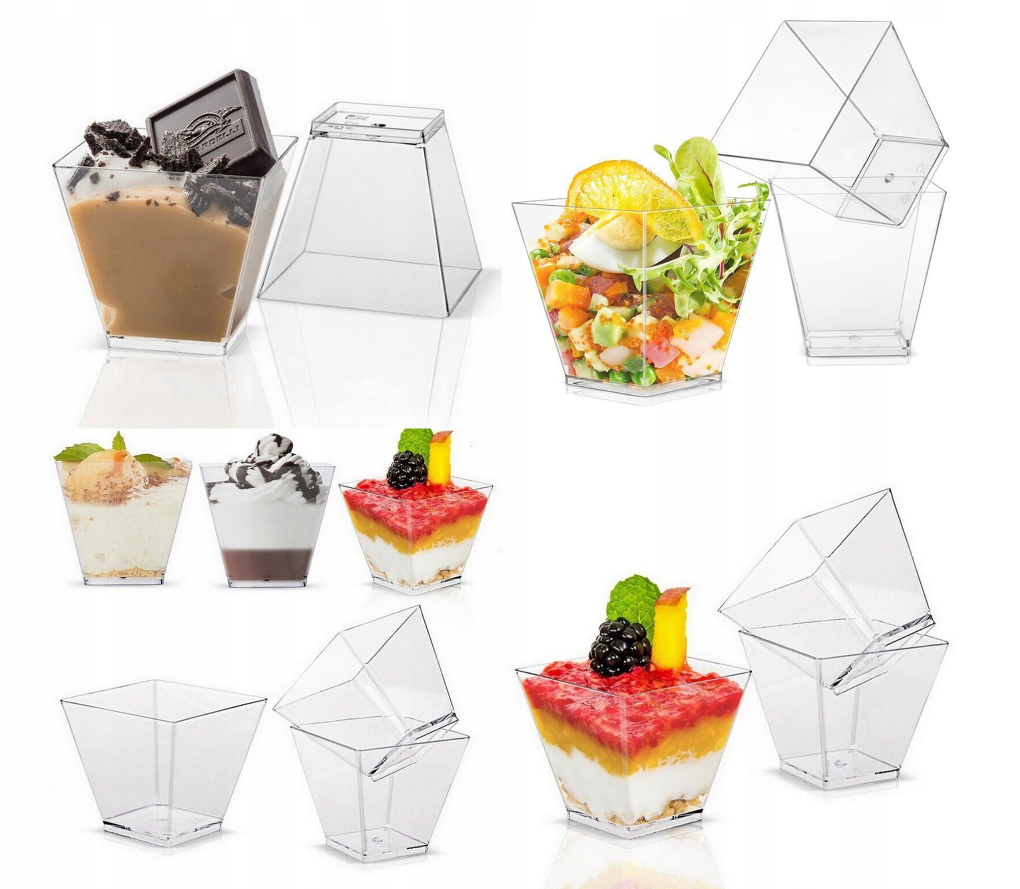 - УНІВЕРСАЛЬНИЙ – ідеально підходить для подачі морозива, мусів, пудингів, невеликих порцій тістечок, желе та багатьох інших солодких делікатесів, а також для листових салатів та інших солоних закусок. Завдяки прозорому матеріалу ми можемо милуватися багатошаровими композиціями та барвистими інгредієнтами, які створюють смачні витвори мистецтва.