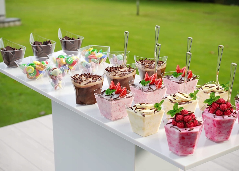 Усі представлені міні-десертні стаканчики є виробами багаторазового використання, що усуває клопоти з їх миттям після використання. Вони виготовлені з високоякісного кришталево прозорого матеріалу PS, завдяки чому дуже добре імітують скло, не позбавляючи гарного візуального ефекту десертів чи закусок, які в них подаються.
