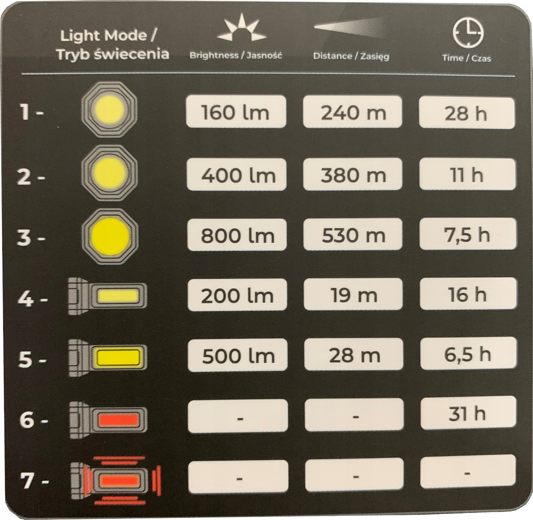 - Потужність світла: до 800 лм - регульоване освітлення в 7 режимах.
