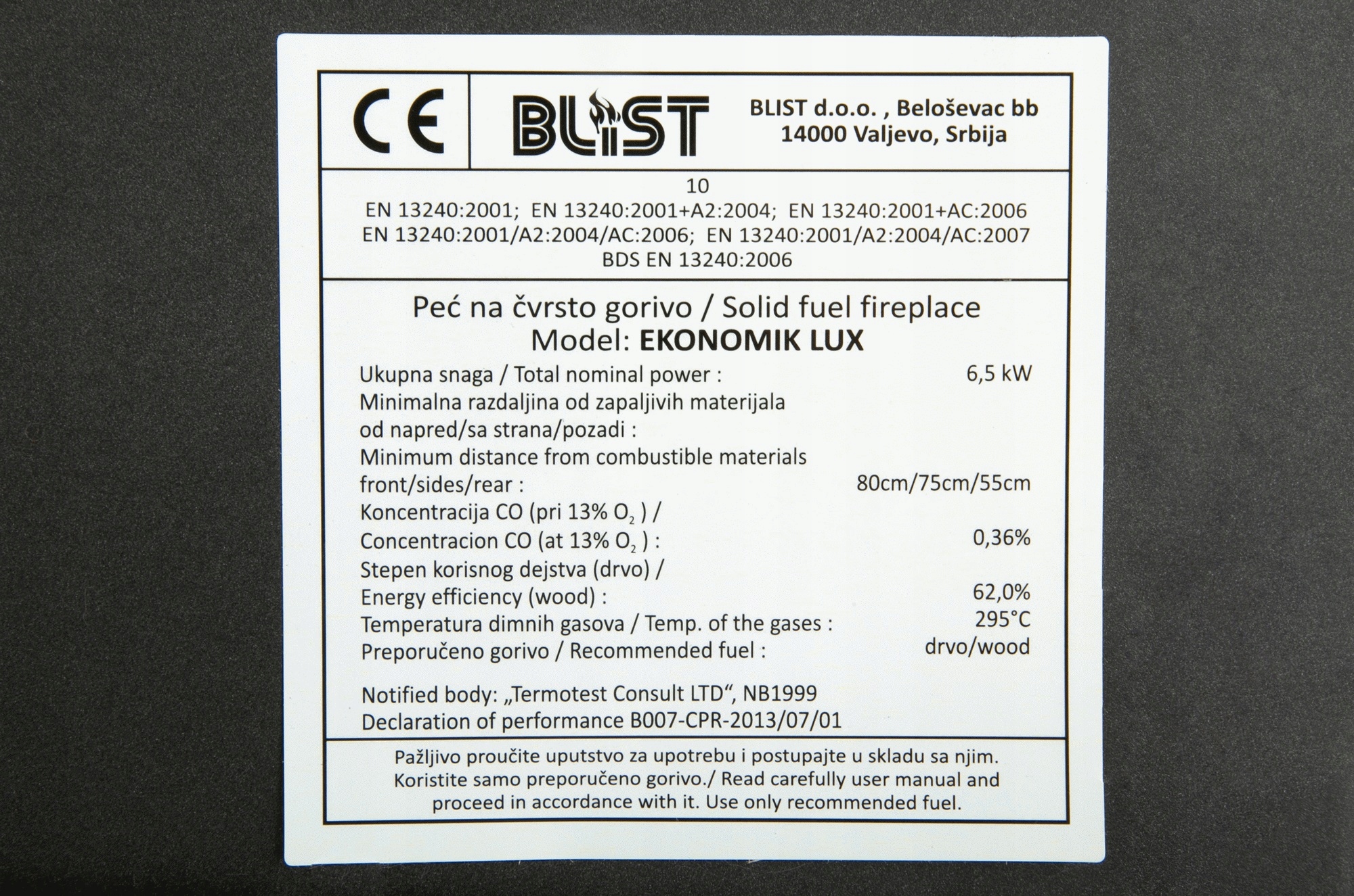 Максимальна потужність каміна дозволяє обігріти приблизно 85 м2 приміщення. Плита має знак CE, що означає, що вона пройшла перевірку авторизованим дослідницьким центром щодо правильності виготовлення, досягнутих параметрів і, найголовніше, безпеки використання. Відповідає всім національним та європейським стандартам. Це можна підтвердити на паспортній табличці каміна, яка містить знак CE та найважливіші параметри печі.