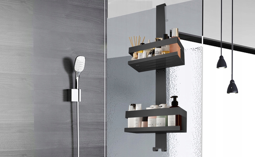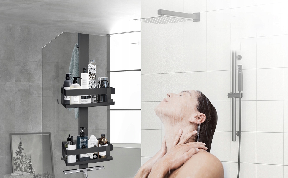 Розмір: Використовуйте прикріплену захисну прокладку EVA, щоб уникнути тертя між склом та кошиком для душу. Кошик для підвісних душ, загальна довжина 66 см, два кошики (23 × 10 × 8 см) забезпечують достатньо місця для гелю для душу, мила, шампуню тощо.