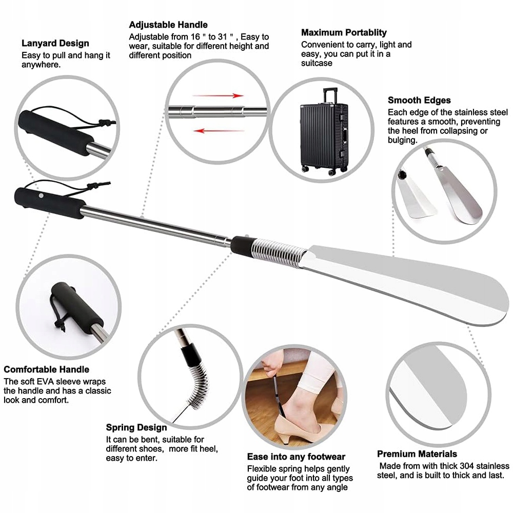 Унікальне теля для взуття з нержавіючої сталі 304 - ідеально підходить для людей, які цінують комфорт та довговічність. Завдяки регульованій довжині (від 42 см до 80 см) та посиленій пружині використання надзвичайно комфортно.