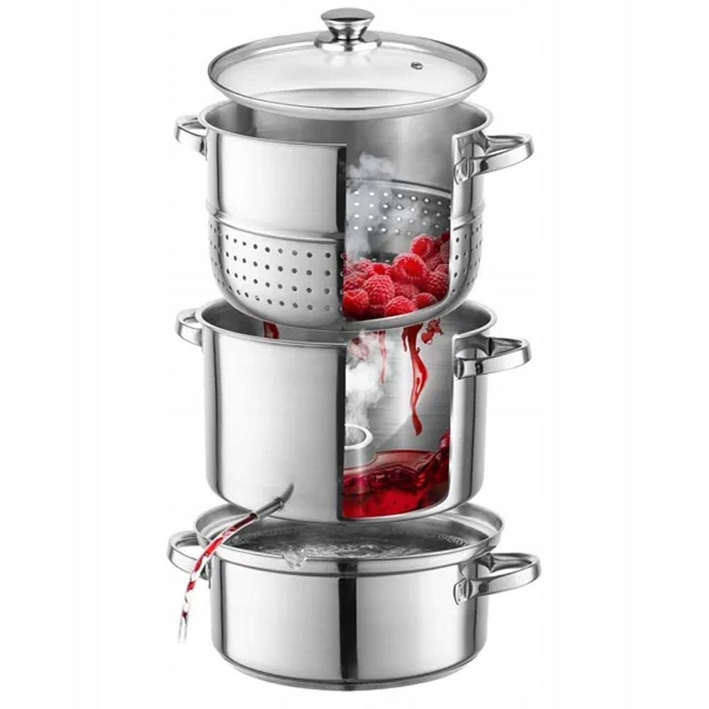 Соковижималка виготовлена з високоякісної нержавіючої сталі, що робить її міцною та довговічною. Відповідна товщина стінок і товсте феромагнітне дно дозволяють соковижималці швидко нагріватися і підтримувати постійну температуру всередині. Завдяки цьому приготування соку займає в середньому від 30 хвилин до максимум 1 години (в залежності від твердості фруктів). З м’якоті, що залишилася після виробництва соку, можна приготувати смачне варення. Завдяки цьому ніщо не буде витрачено даремно. Сік зливається через шланг в обрану вами ємність - нічого лити не потрібно! Все робиться само собою. Ви також можете використовувати нашу соковижималку як пароварку! Не вагайтеся та купуйте зараз!