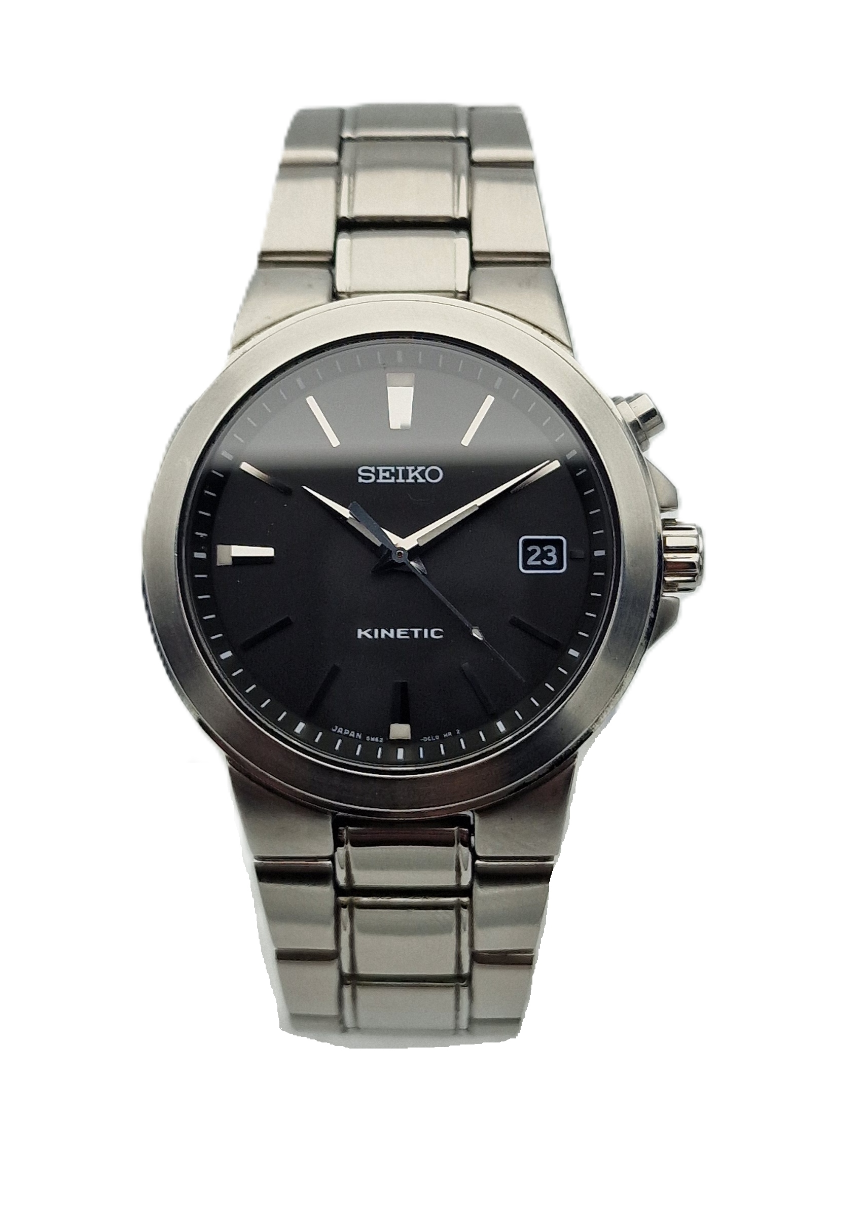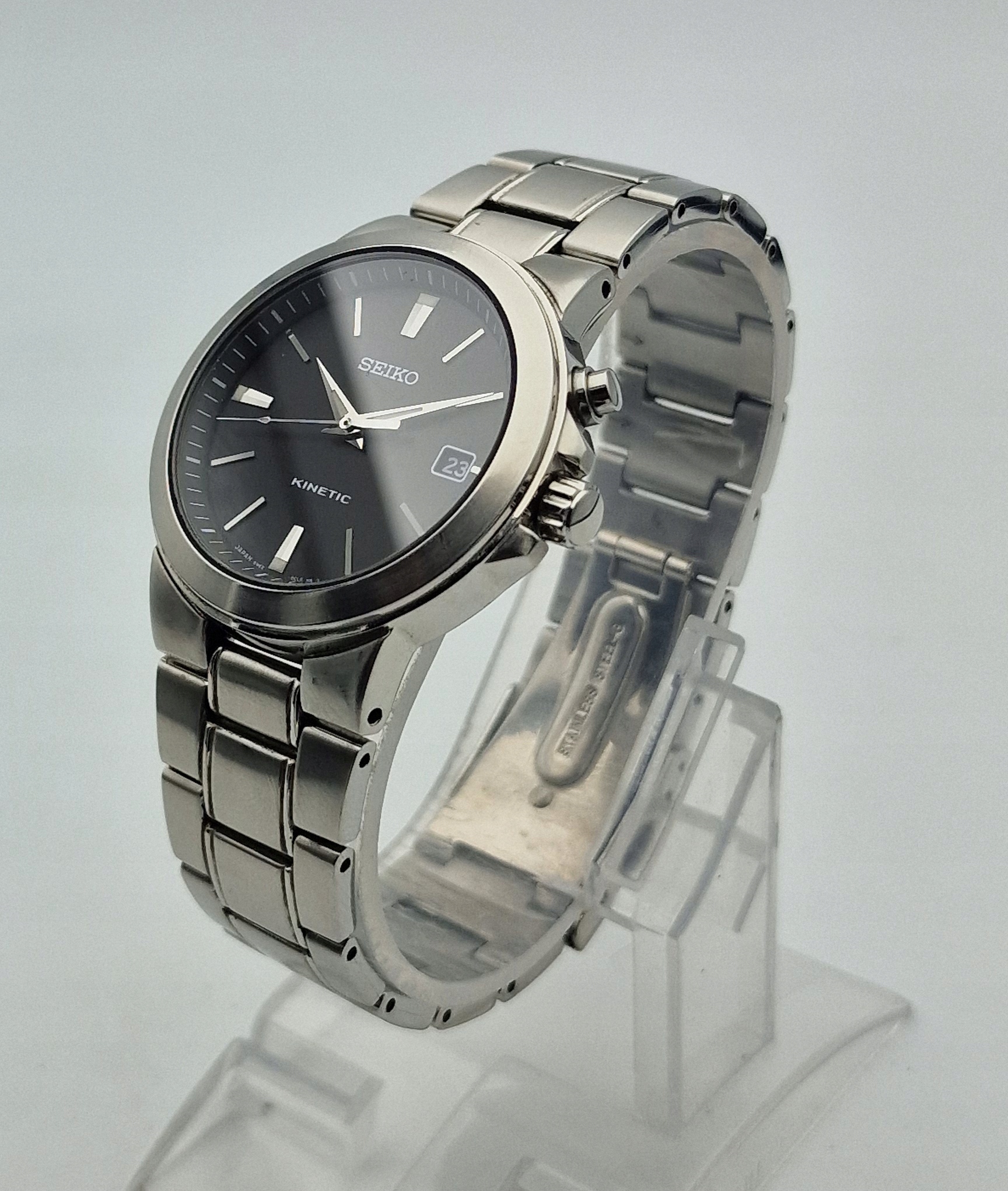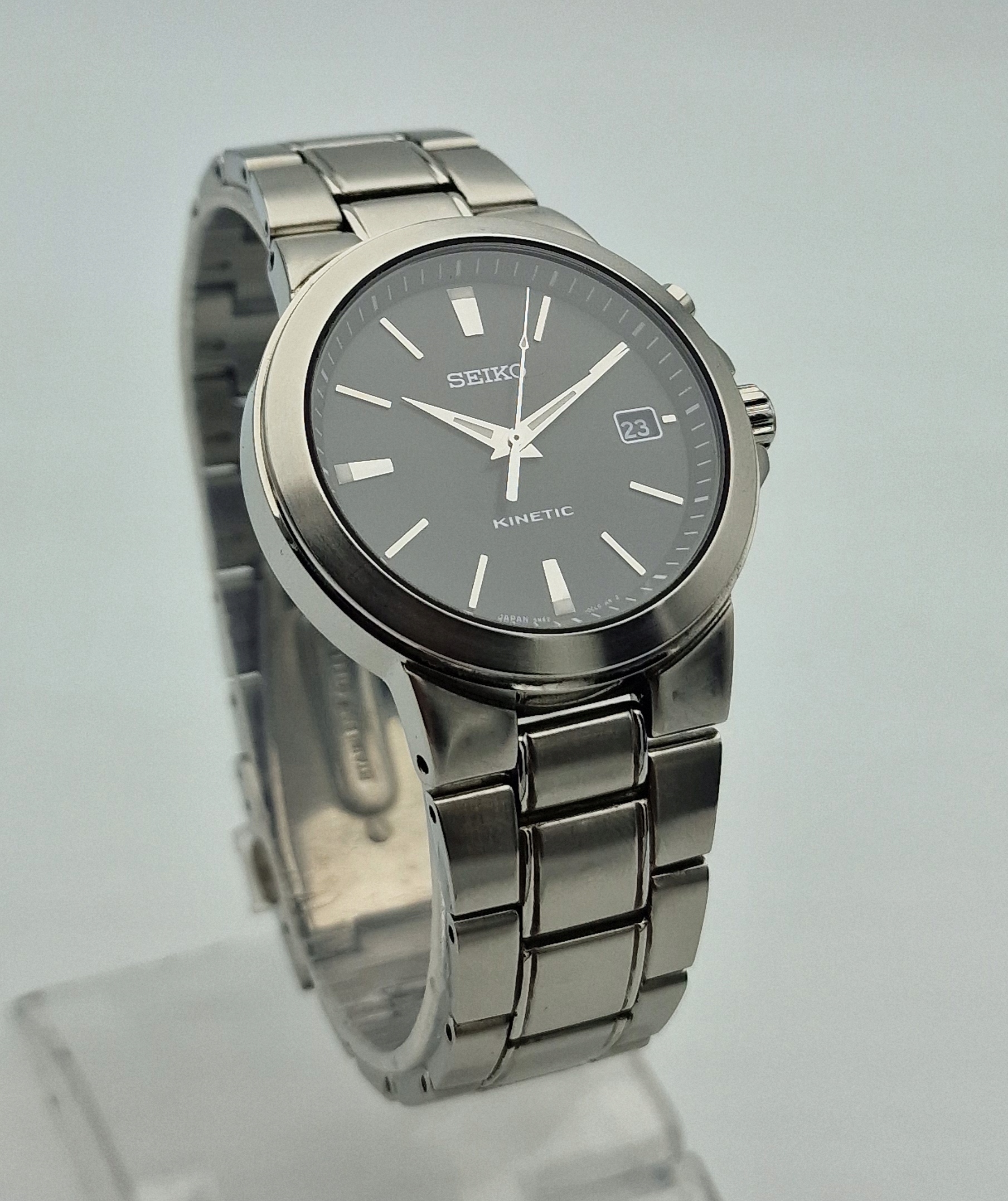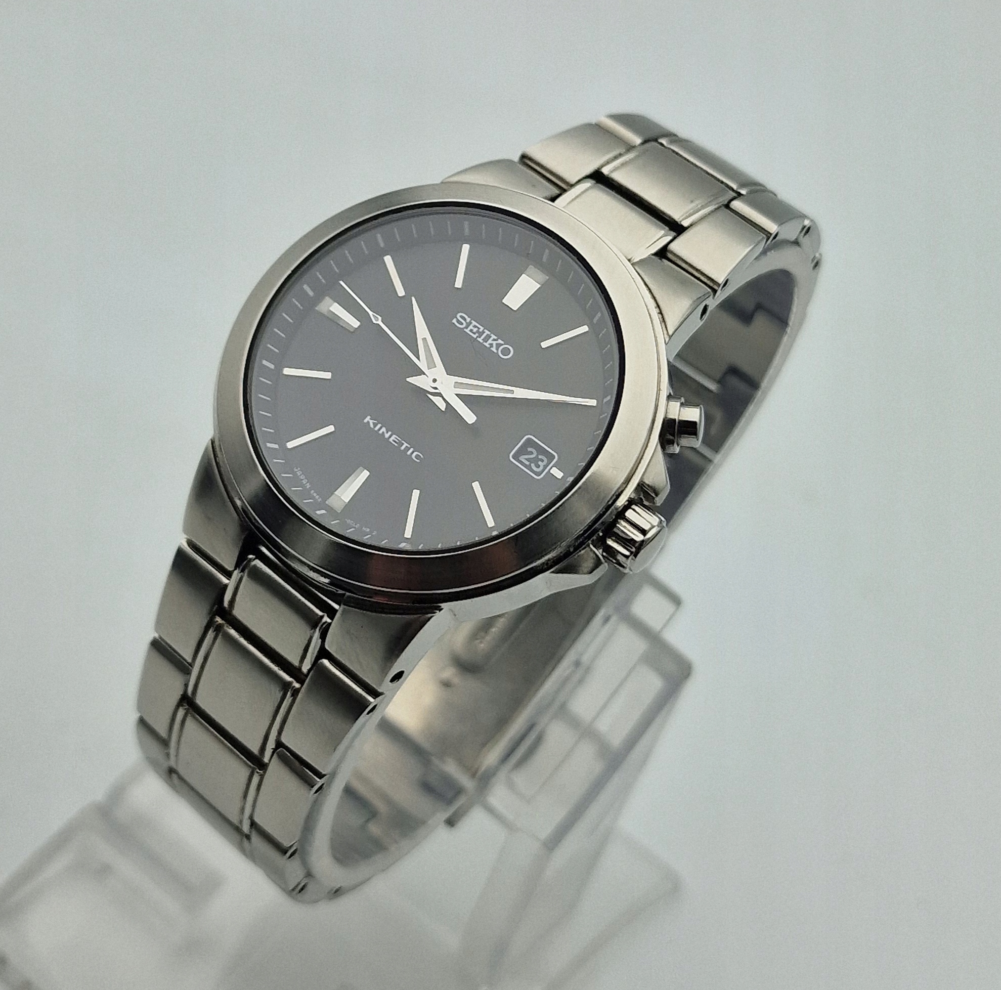- Чорний щит із срібними маркерами та штампом побачень о третій годині. Підписаний щит: " seiko, Kinetic, Японія ". Щит у ідеальному стані, який представлений фотографіями аукціону.