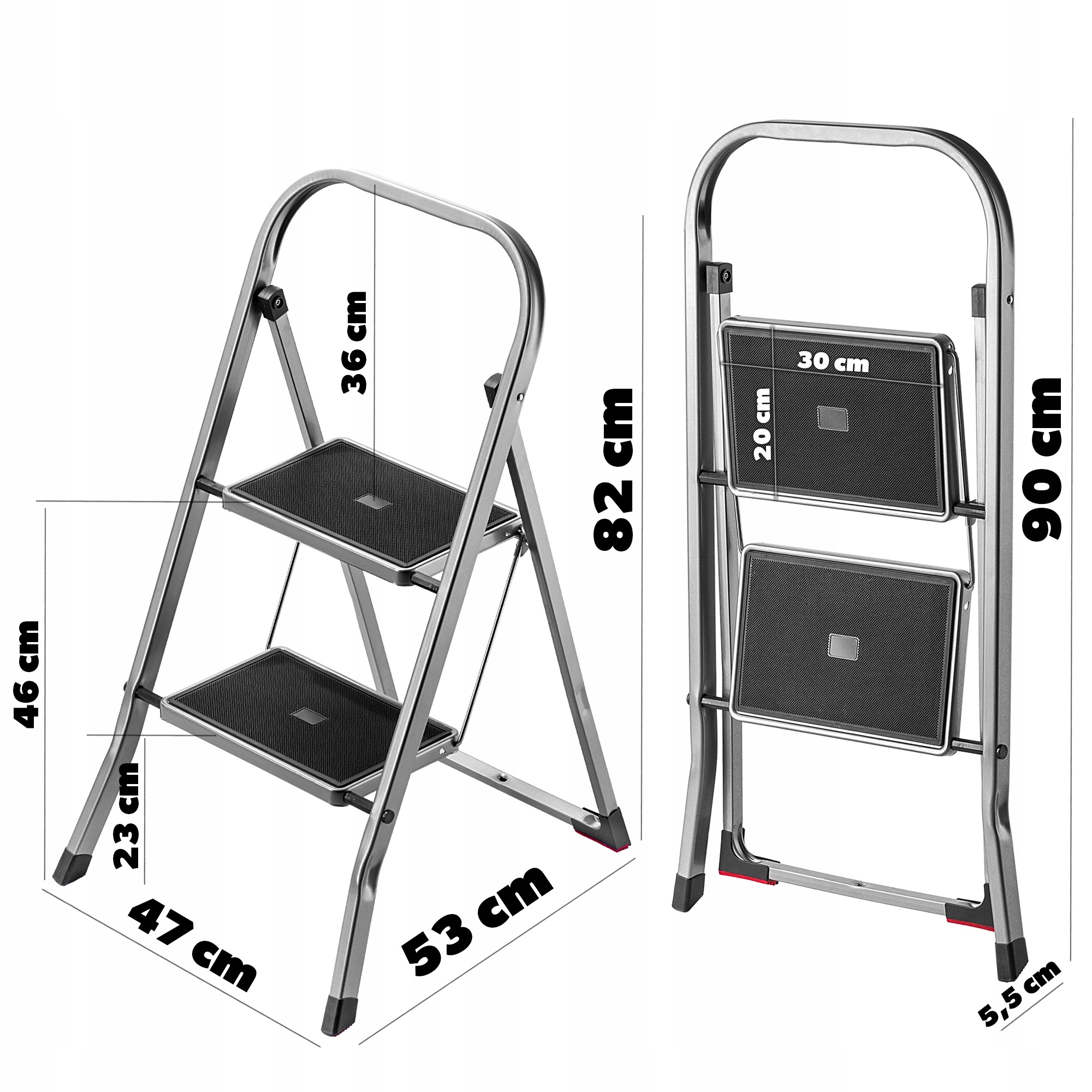 - Розміри драбини в розкладеному стані: 47 x 53 x 82 см