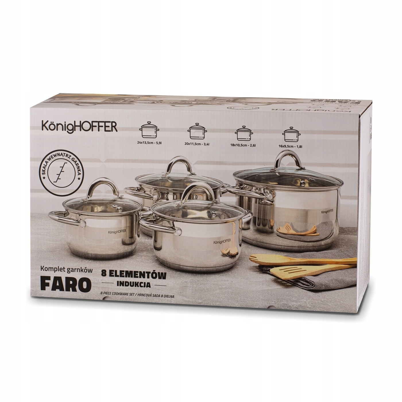 Елемент 2: каструля з кришкою, - діаметр: 18 см, - розміри: 26,5 x 19 x 16 см, - висота каструлі без кришки: 10,5 см, - діаметр зони нагріву : 15 см, - загальний об'єм: 2,6 л, - корисний об'єм: 2,1 л