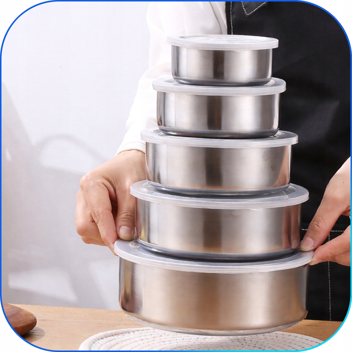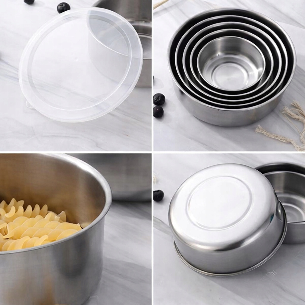 Практичний набір з 5 сталевих мисок з нержавіючої сталі з кришками є універсальним обладнанням для кожної кухні. Вони ідеально підходять для приготування їжі, зберігання їжі та подачі страв.