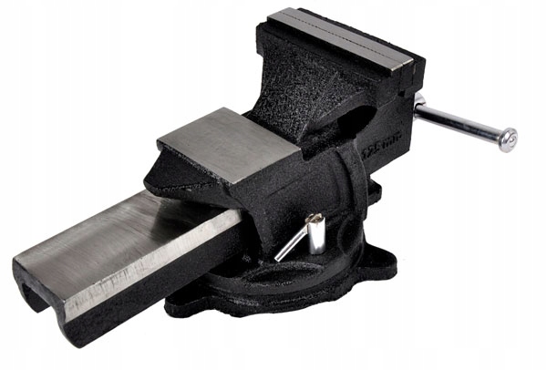 Слюсарні лещата для затискання предметів, що підлягають ручній обробці, з поворотною основою, що дозволяє обертати лещата на 360°.