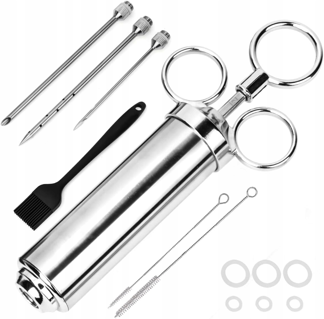 Набір містить три голки: голка 15 см з 12 отворами для рідких маринів, голкою 15 см з великим отвором для більш товстих маринадів та голкових шматочків м'яса, таких як стейки та шашлики. Кожну голку легко замінити.