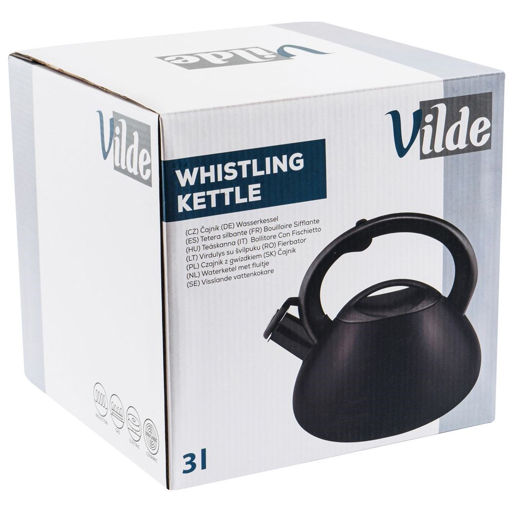 Привабливий чайник, виготовлений з матеріалів найвищої якості. Ми будемо використовувати його для кип'ятіння води для кави, чаю або для заварювання трав. Зручний у використанні завдяки ручці, кришці та автоматичному свистку. Ми можемо кип'ятити воду в чайнику дуже швидко, а чистити його дуже зручно. Чайник - чудова ідея подарунка. УВАГА! Чайник повинен бути заповнений принаймні наполовину, щоб уникнути перегріву. Зміни кольору на зовнішній поверхні у разі невідповідності мінімальним параметрам експлуатації не можуть бути приводом для рекламації. Оригінальна продукція Vilde. Виготовлена відповідно до європейських стандартів.