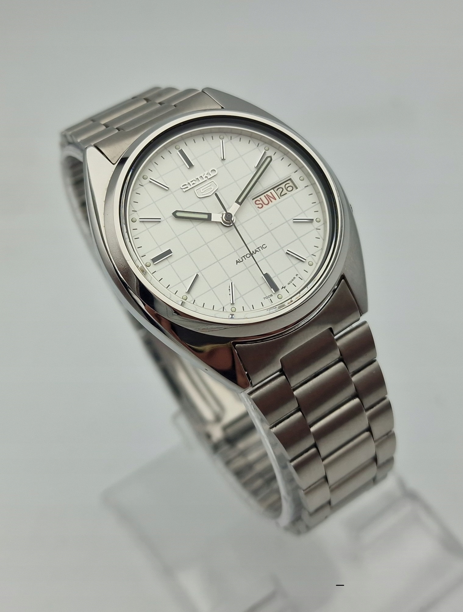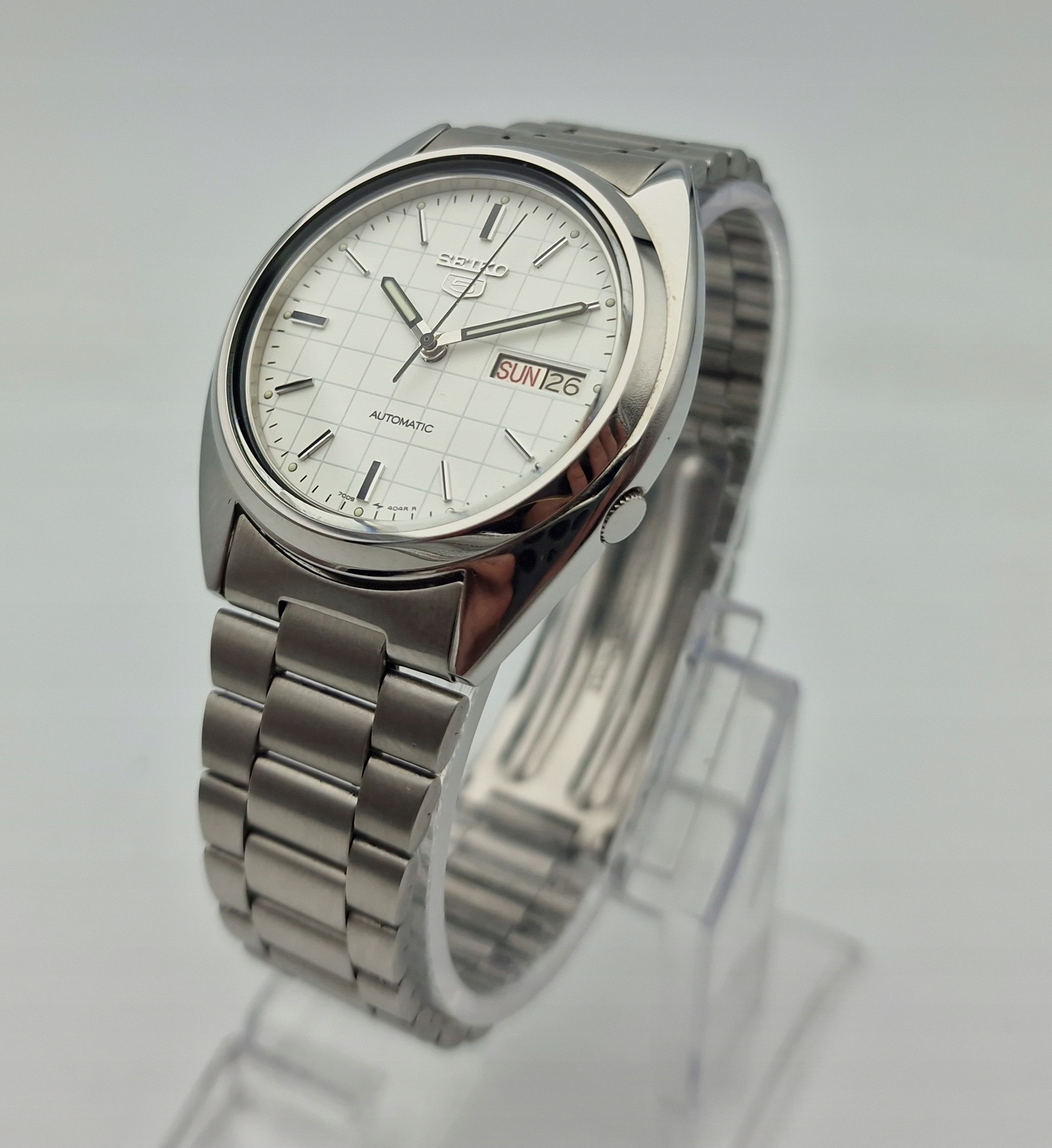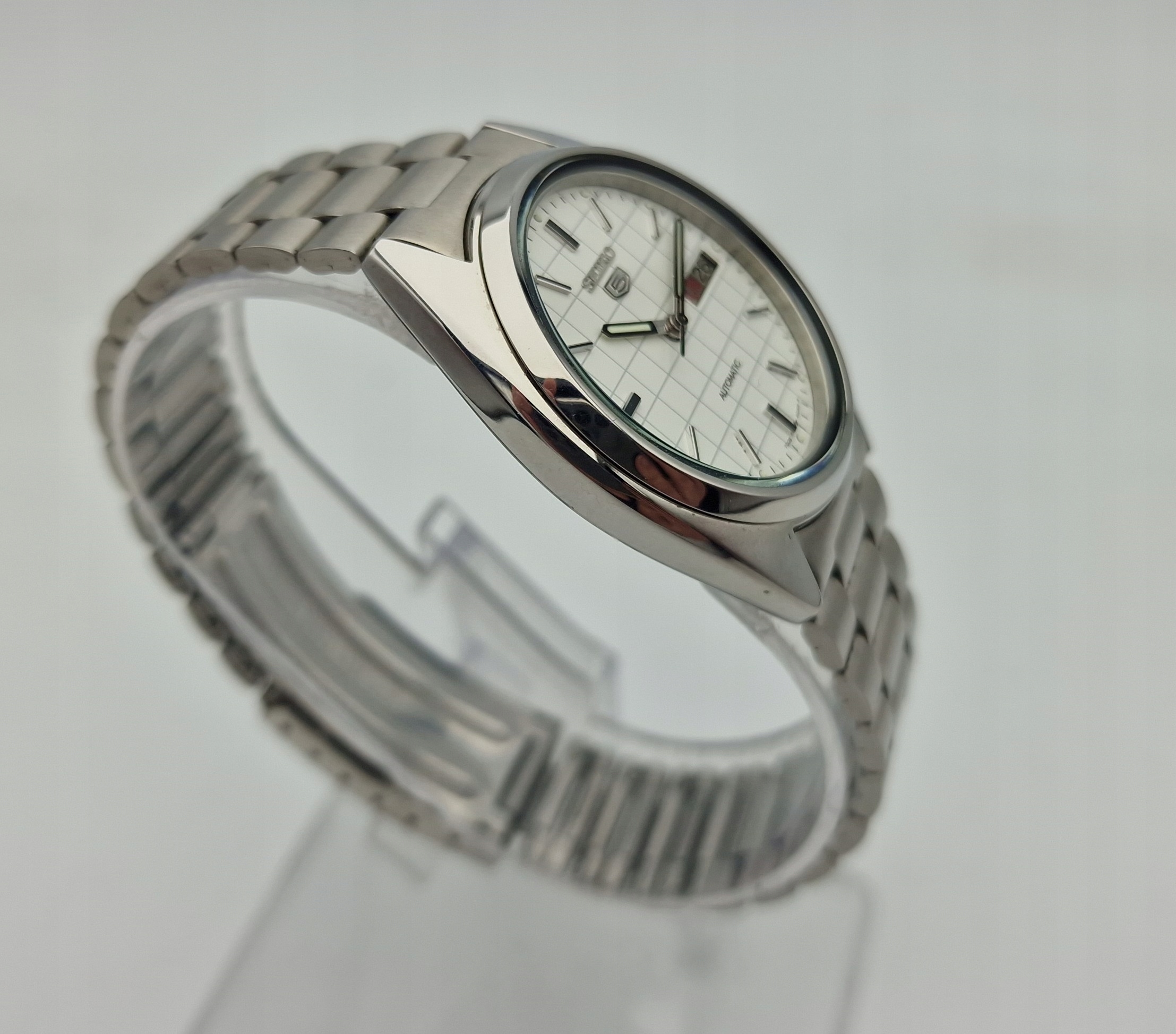 - білий металевий щит з цікавою прикрасою з побаченням на трьох годин. Підписаний диск: " seiko 5, автоматичний ". Щит у ідеальному стані, який представлений фотографіями аукціону.
