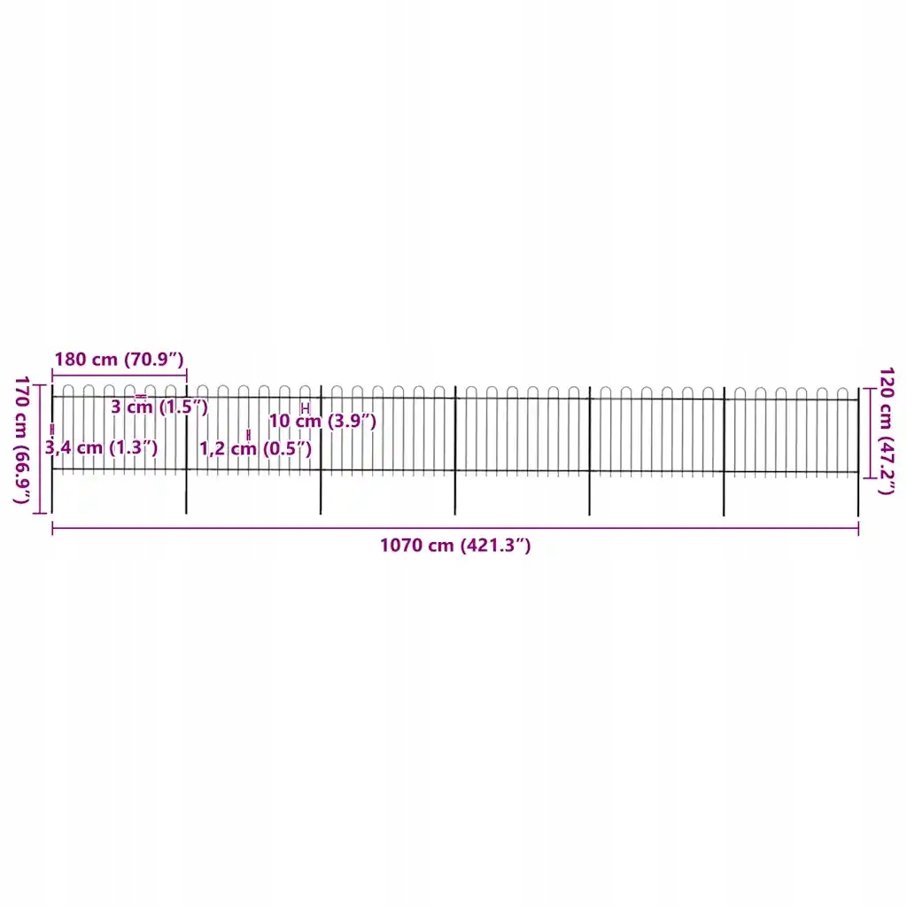 Створіть елегантний паркан навколо свого саду чи дому! Цей декоративний, сталевий паркан, що складається з 6 панелей та 7 стовпів, має загальну довжину 10,2 м. Це створить сильну, безпечну і не вимагатиме обслуговування кордону вашого саду, середовища проживання чи комерційної зони.