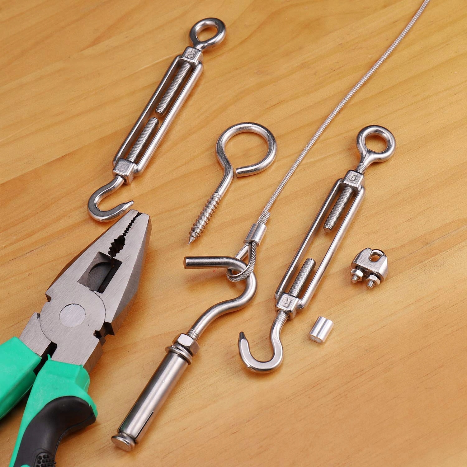 ⬅ло Набір натягувача дроту з поворотною пряжкою: міцний гачок та виноградарство в наборі - ідеальний пристосування для призупинення саморобних завдань для важких завдань, все виготовлених з 304 нержавіючої сталі. Алюмінієвий затискаючий рукав, виготовлений з алюмінію, забезпечує хорошу стійкість до корозії та іржі, у кожну погоду та скрізь!