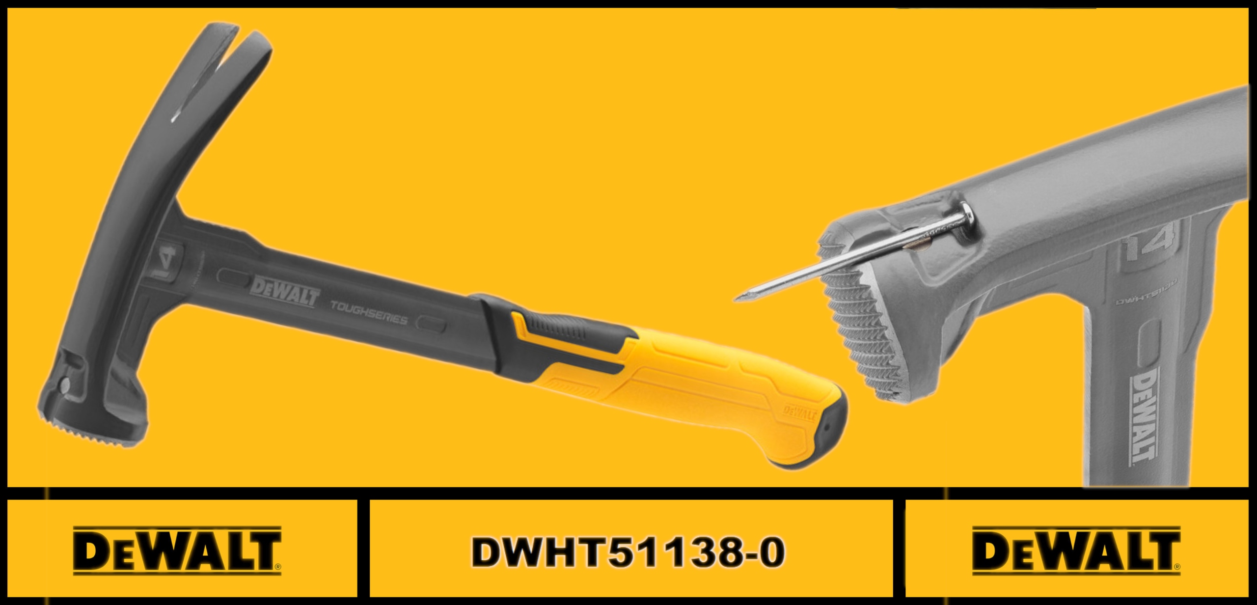сталевим молотком з гладким окучі та магнітною ручкою для нігтів Dewalt з загальною вагою 570 г. Цвяхи та скоби, що дозволяє їм бути легкими та швидкими. Ручка з матеріалу, що поглинає вібрації, зменшує втому вручну під час роботи.