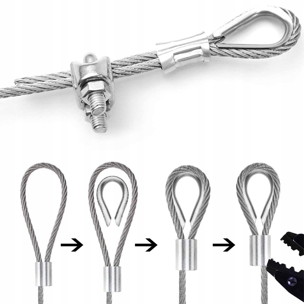 Трос з нержавіючої сталі 3 мм потребує міцного різака дроту; Алюмінієва обтискна петля M3 потребує гідравлічного обжимного інструменту, обтискних з’єднувачів і затягування дроту; Кабельні затискачі M3 для дротяної мотузки підвищують зручність користувача, який не має гідравлічного інструменту для обжиму та може замінити алюмінієву обтискну петлю, просто затягнувши гвинти маленьким гайковим ключем.