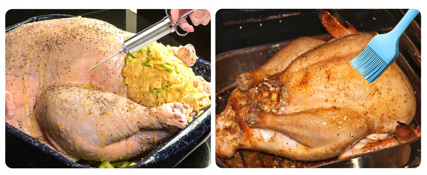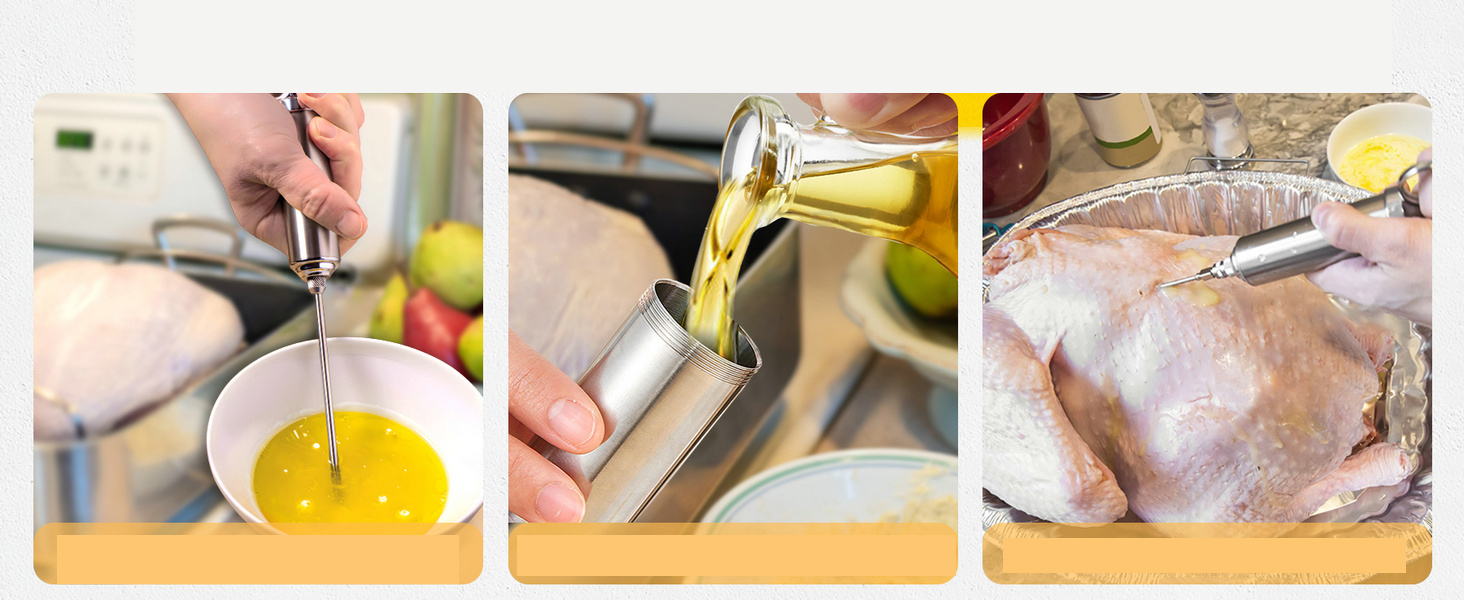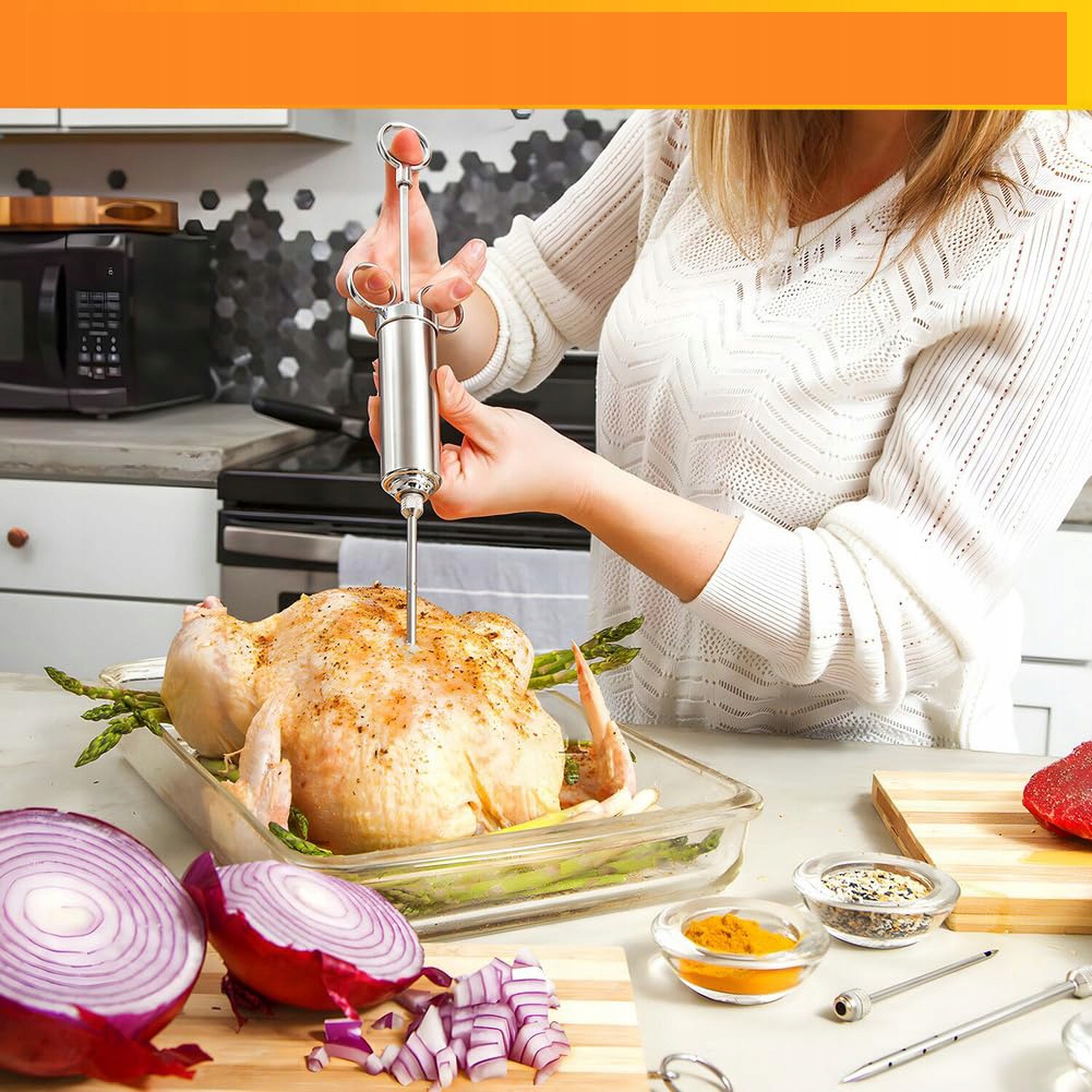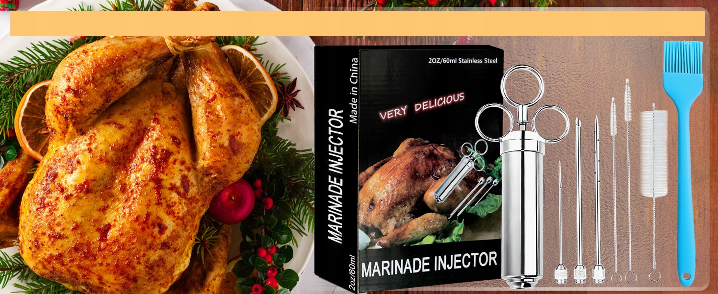 М’ясо з ідеальним смаком: Поліпшення смаку та соковитості вашої страви завдяки цій універсальній ін'єкції. Ідеально підходить для маринації Туреччини на День подяки, яловичину на Різдво, свинину, ягня, курку, гуси чи качку. Він також чудово підходить для введення смаку в десерти, такі як пончики з желе або полуницею, просоченою ромом, а також для вилікування домашнього м’яса.
