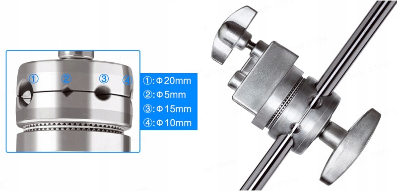 Завдяки котушці, яка з'єднує триногу з поперечиною (рукою), ви можете регулювати як кут нахилу кронштейна відносно триноги, так і розташувати стрілу у вертикальному напрямку. Рука є закінчується з одного боку штифтом 16 мм з різьбою 1/4", а з іншого 3/8", завдяки чому ми можемо використовувати багато студійних аксесуарів без необхідності використовувати адаптери.