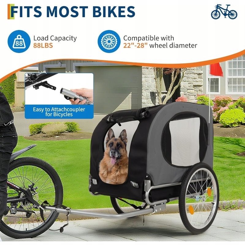 - 【Проста сумісність із велосипедом і безпечне налаштування】: цей велосипедний причіп для собак підходить для велосипедів із колесами 22-28 дюймів із швидкоз’єднувальним з’єднувачем без інструментів, забезпечуючи стабільне буксирування домашніх тварин вагою до 88 фунтів (40 кг). Вібраційна зчіпка кріпиться до більшості велосипедів менше ніж за 2 хвилини, завдяки тросам безпеки, щоб тварини не з’їжджали з коліс – ідеально підходить для безпроблемні пригоди на вулицях або стежках.
