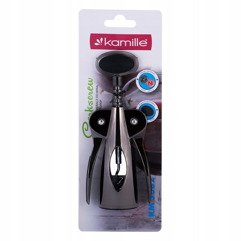 Відкривачка для вина Kamille виготовлена з високоякісного сплаву цинку. Має зручні ручки, покриті протиковзкою гумою, завдяки чому відкривачка добре лежить в руці.