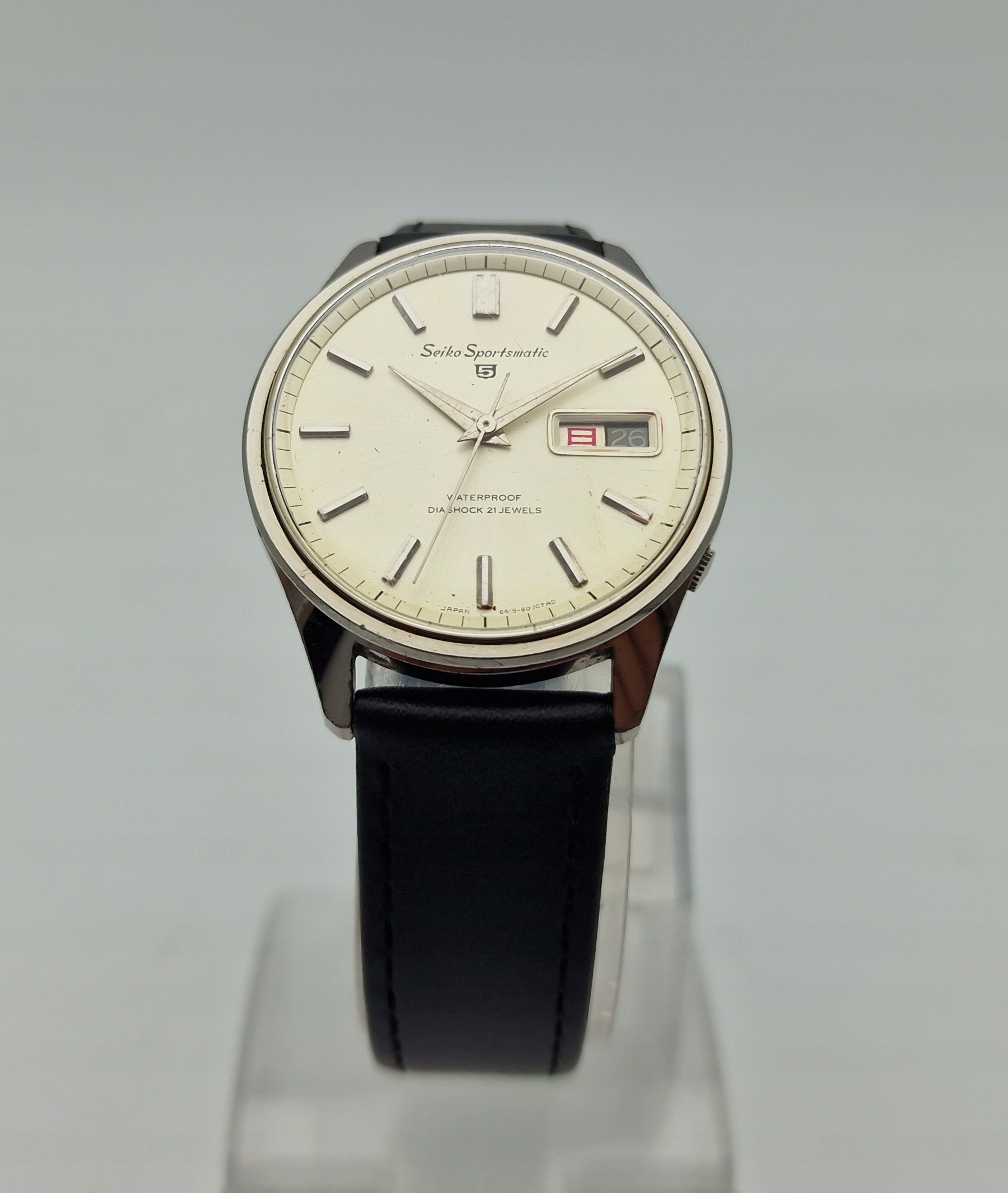 - Сріблястий металевий циферблат із відображенням дати на третій годині. Циферблат підписаний: «SEIKO 5, SPORTSMATIC, WATERPROOF, DIASHOCK 21 JEWELS, JAPAN». Циферблат у ідеальному стані, як показано на фотографіях з аукціону.