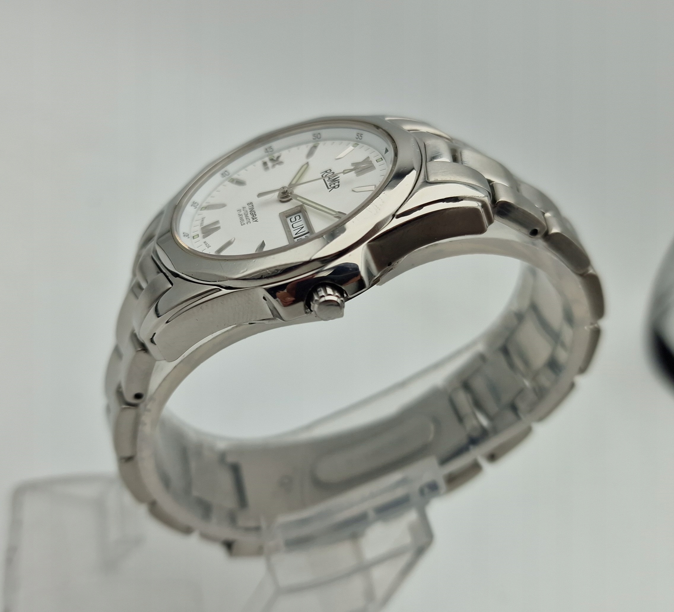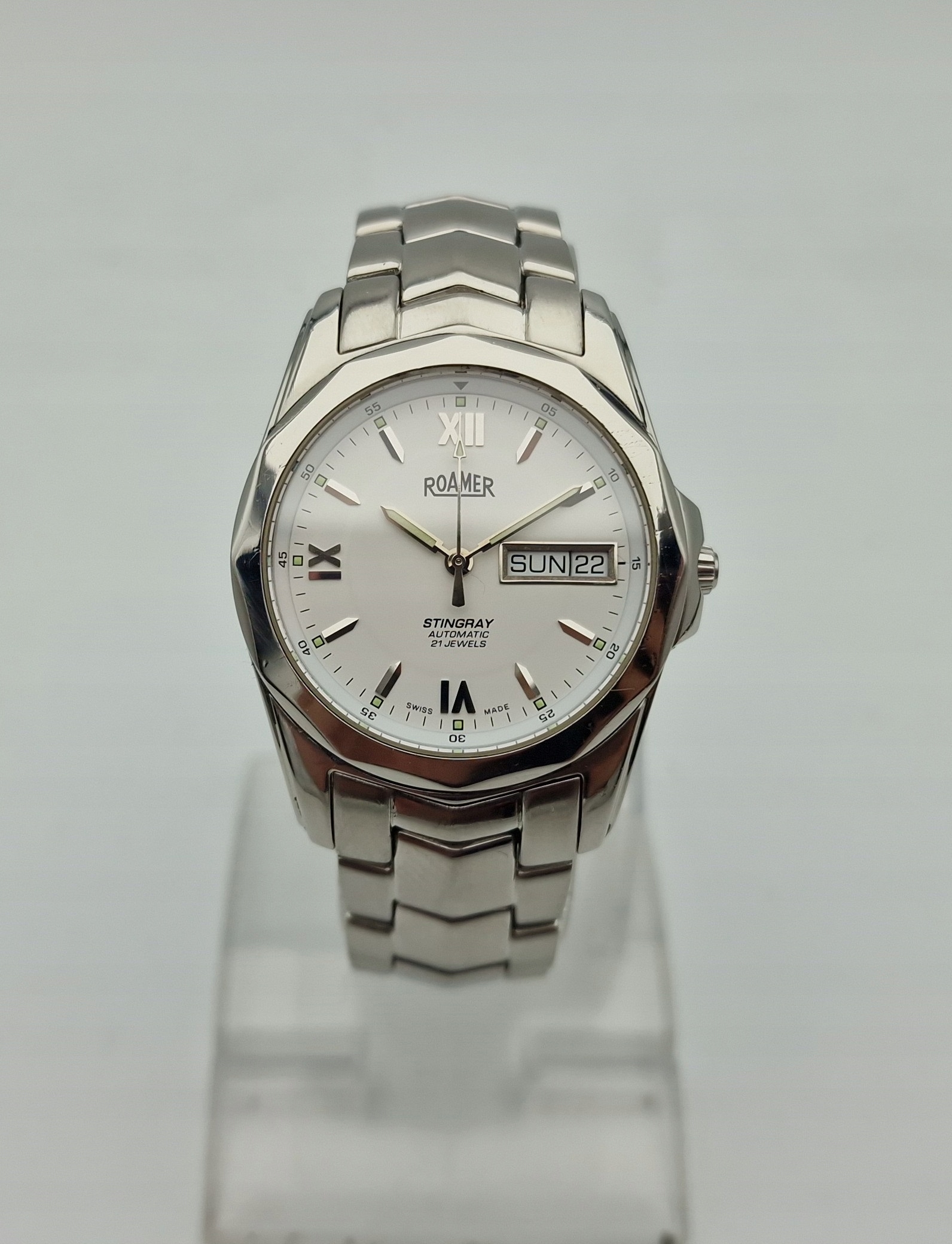 - Білий металевий циферблат із відображенням дати на третій годині. Оригінальний циферблат, на ніжках, підпис: «ROAMER, STINGRAY, AUTOMATIC, 21 JEWELS, SWISS MADE». Циферблат в ідеальному стані, як на фото.