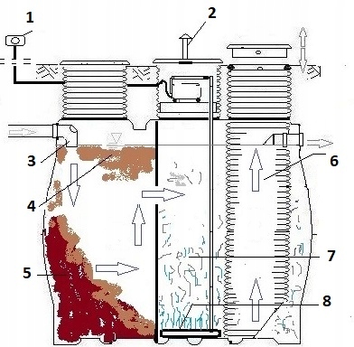 Мета: Очисна споруда призначена для очищення стічних вод побутових і господарських приміщень від одноквартирних будинків, ферм і будинків відпочинку. Пристрій дуже високо очищає стічні води в процесі обробки активним мулом з низьким навантаженням і відповідає вимогам стандарту PN-EN 12566-3. Очищені стічні води можна скидати в землю через дренаж, фільтраційні тунелі, поглинальні колодязі або використовувати для поливу зелених насаджень. Очищені стічні води також можна скидати у водотік, резервуар або ставок.