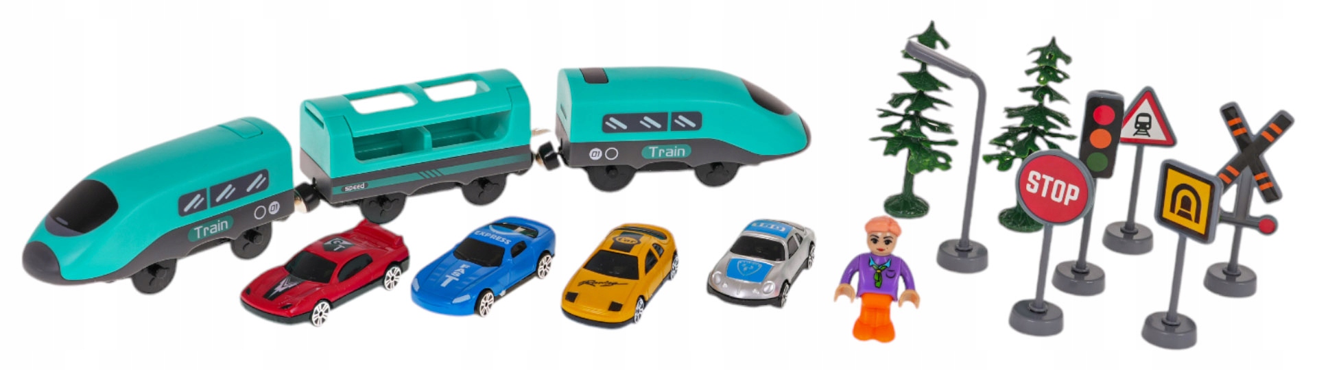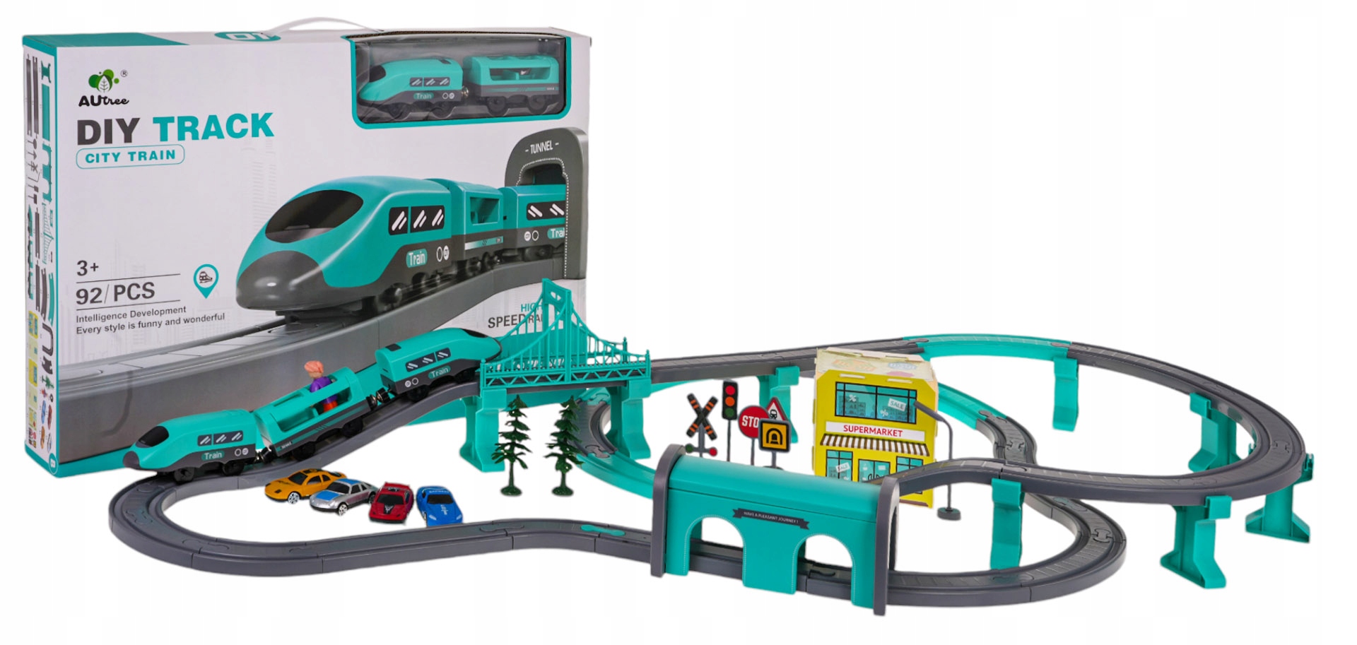 багатий набір композицій з поїздом та аксесуарами для дітей віком від 3 років. Набір виготовлений з найкращої якості пластику в яскравих кольорах, які приваблюють зір дитини. Набір включає 92 елементи: конструкційні деталі, потяг, станція, міст, супермаркет, дорожні знаки, а також автомобілі та фігурка. Потяг працює від 2 X AAA 1,5 В акумуляторами (не входить до набору). Функції набору: