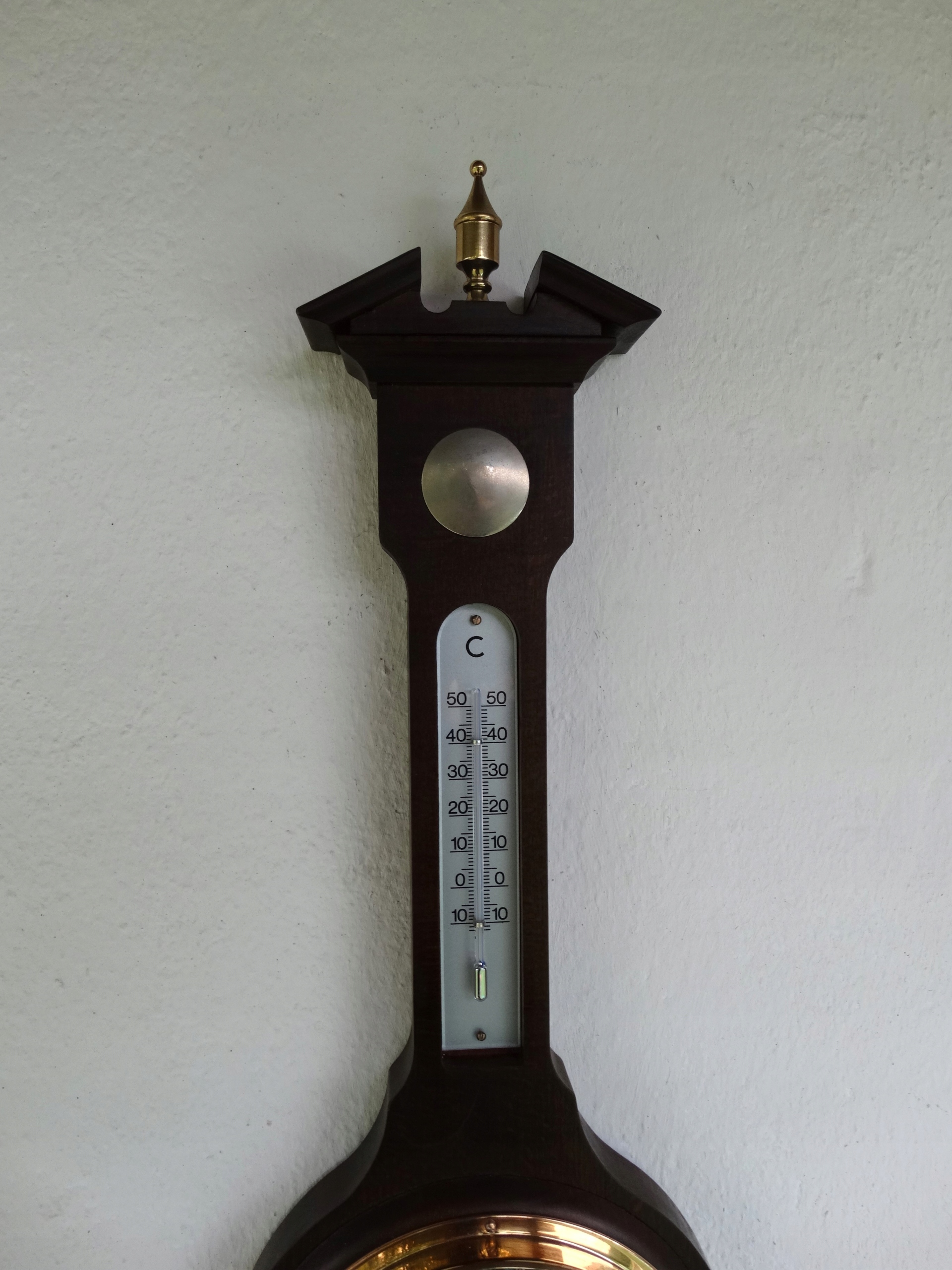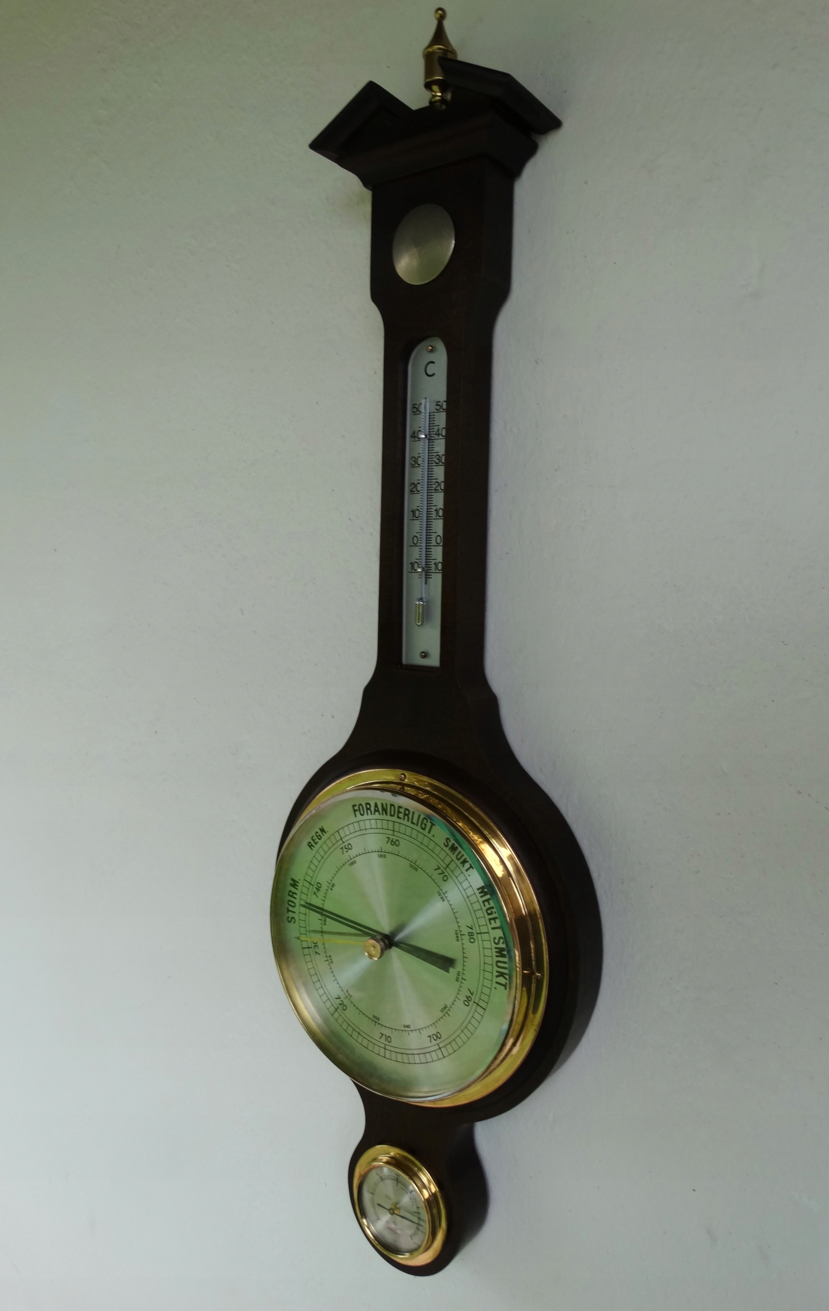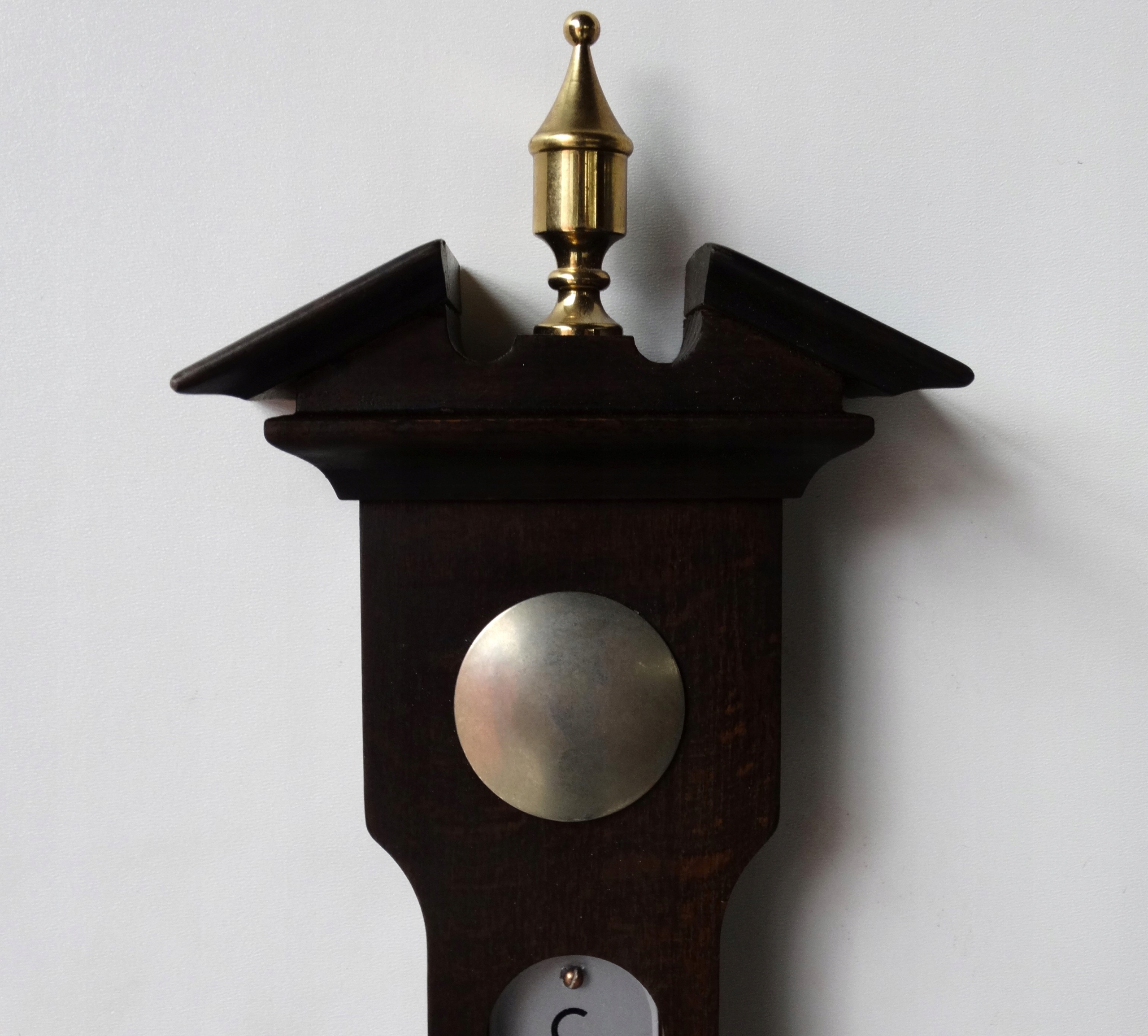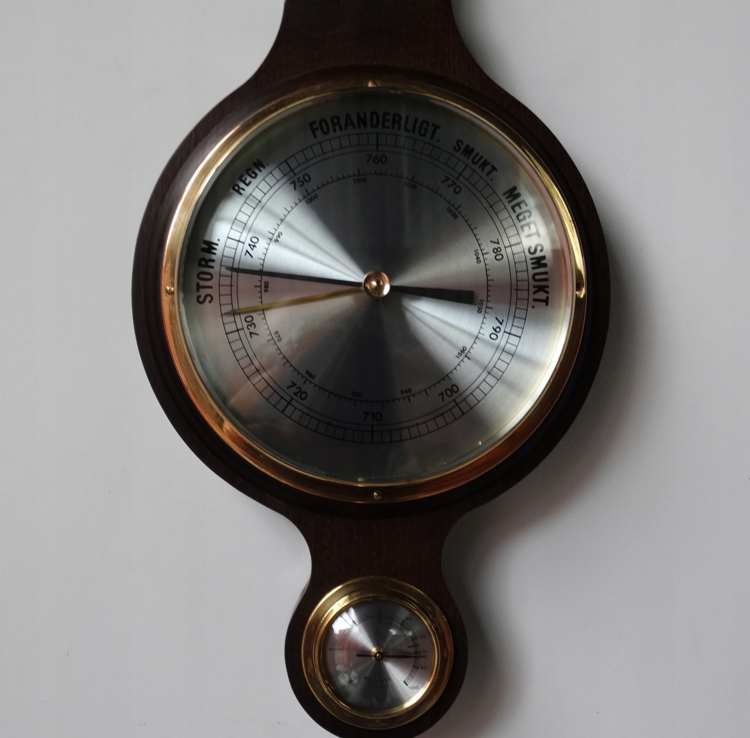 Метеостанція 3 в 1, барометр, гігрометр, термометр. Дерев'яна рама з горіха з латунними елементами. Підходить як для сучасних, так і для класичних інтер'єрів. Має сліди нормального використання, видно на фото, ніде не пошкоджено.