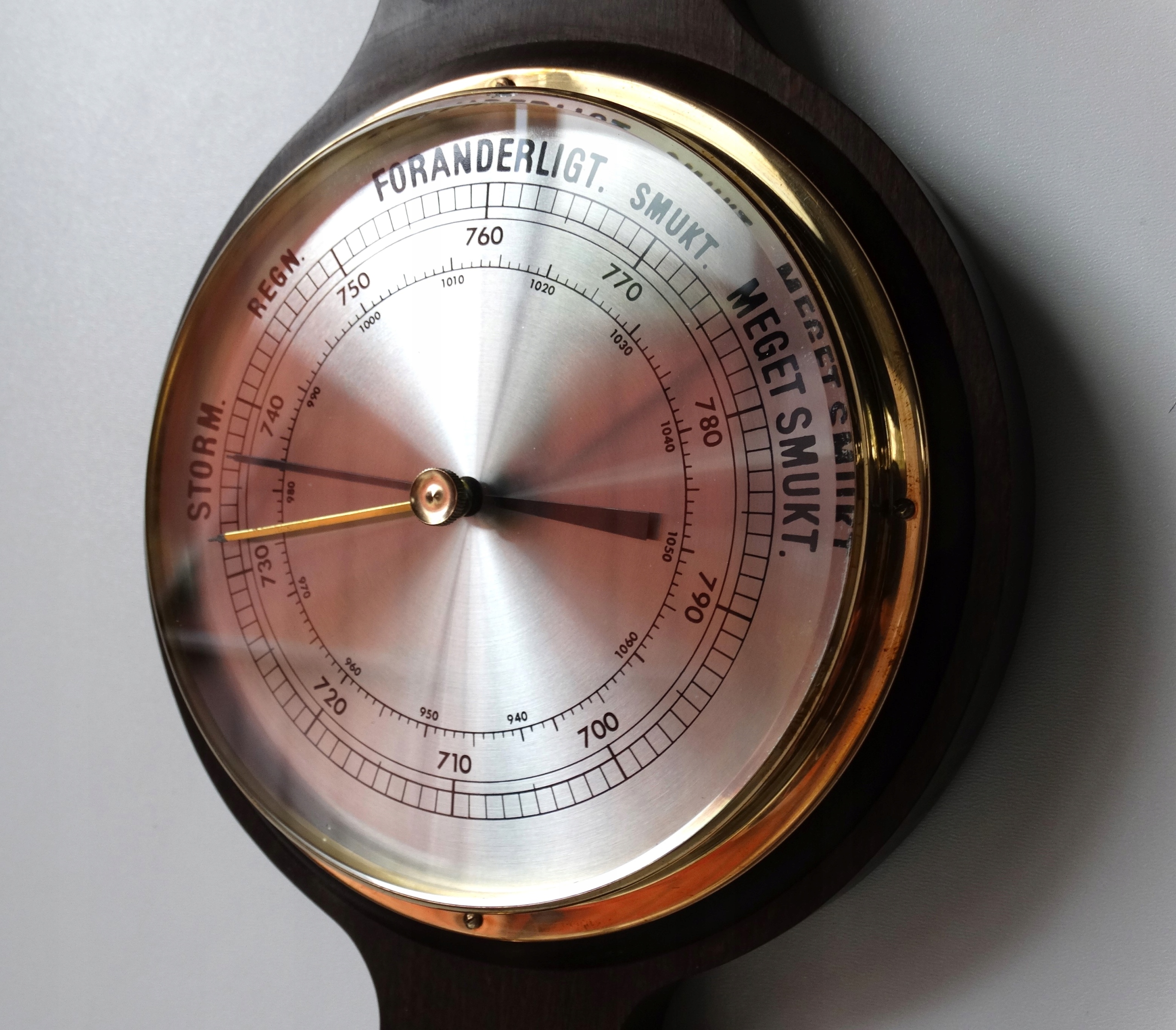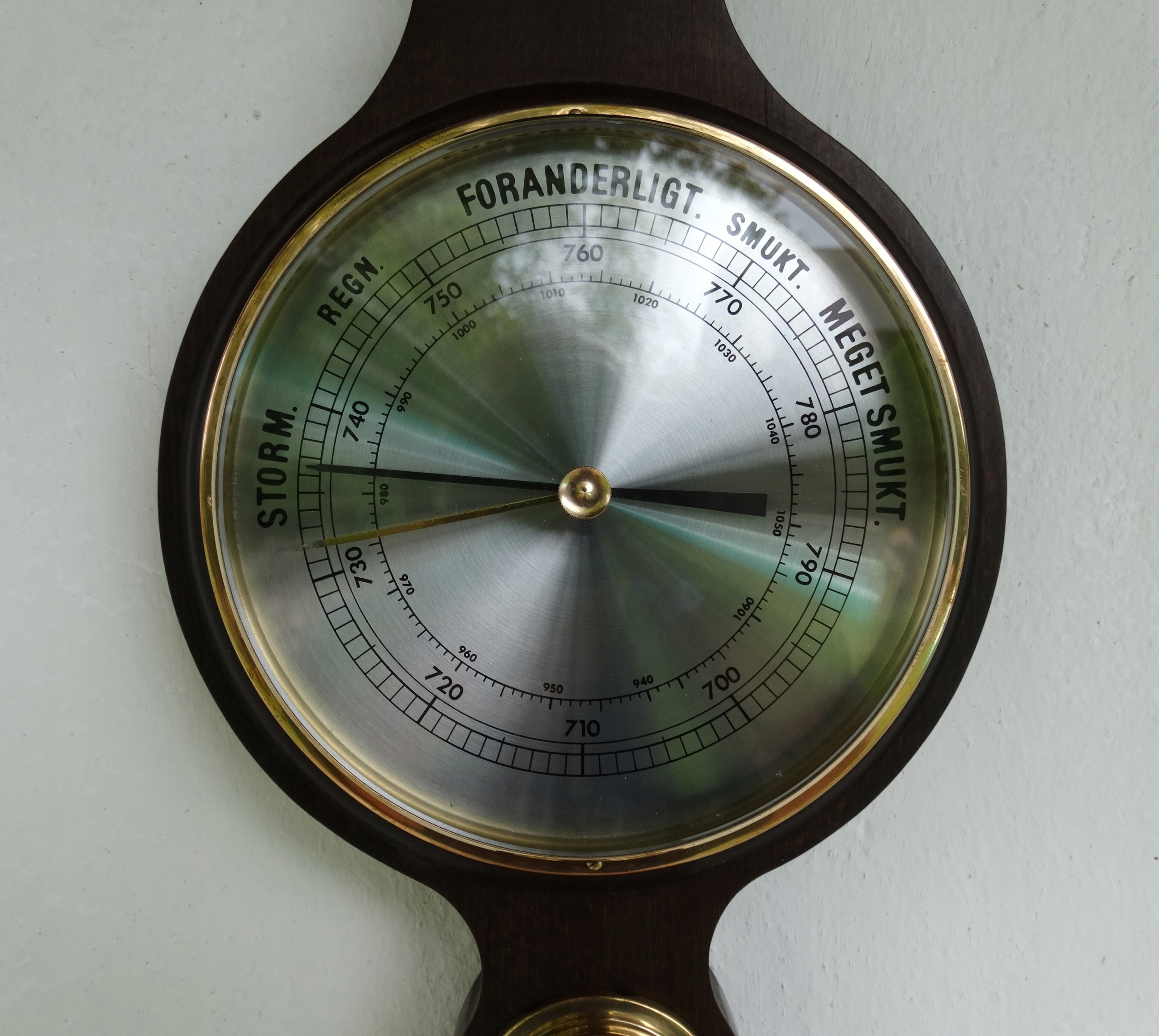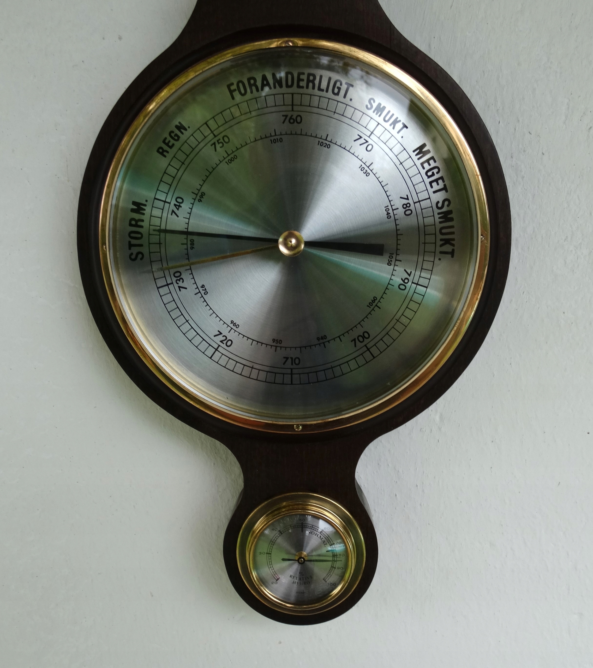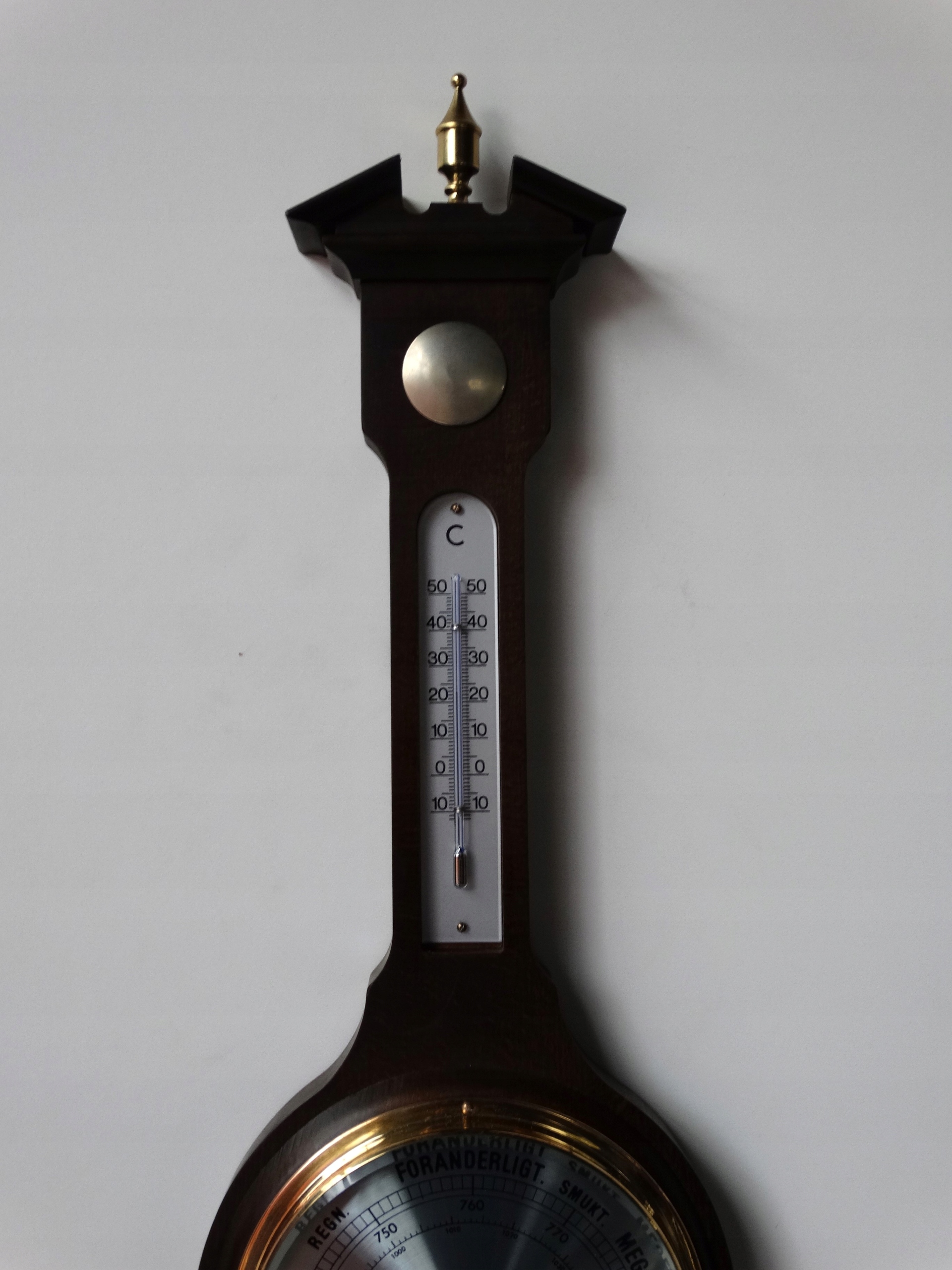 Метеостанція 3 в 1, барометр, гігрометр, термометр. Дерев'яна рама з горіха з латунними елементами. Підходить як для сучасних, так і для класичних інтер'єрів. Має сліди нормального використання, видно на фото, ніде не пошкоджено.