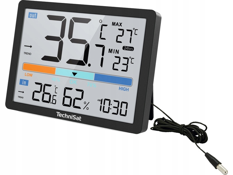 метеостанція від technisat imeteo 110 - це компактний пристрій для вимірювання температури та вологості у кімнаті. Він оснащений дротовим зондом з кабелем довжиною 1,4 -метром для вимірювання температури зовні. Станція має мінімальну та максимальну зовнішню температуру. На освітленому РК -екрані відображення інформації про поточний час, індикатор комфорту та тенденція змін температури . IMETEO 110 має невеликі розміри 8,6 × 6,6 × 1,2 см і важить лише 87 г, що дозволяє розмістити його де завгодно. у задньому корпусі станції є два сильні магніти , які дозволяють прикріплювати його до металевих поверхонь, наприклад. двері холодильника. Станція живиться від акумулятора CR2032, яка не входить до набору.