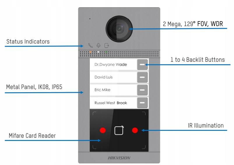 Пристрій складається з ширококутної камери з роздільною здатністю 2mpx @1920x1080, двосторонньої системи голосового зв’язку кнопка виклику та контактного зчитувача карт та кілощів ключів.