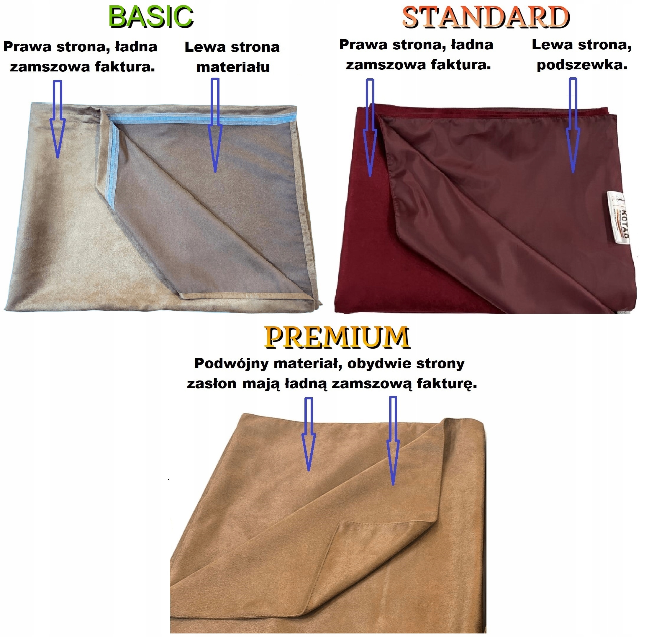У версії Бассичні штори зшиті Один матеріал (штори мають так, що лівий матеріал), у версії стандарт штори вшиваються матеріалом та в підкладці (права сторінка зшиті подвійним матеріалом (права і ліва сторона приємна текстура матеріалу). Ми Єдина компанія пропонує штори преміум з подвійним матеріалом , більшість компаній інформують про подвійний матеріал у значенні лічильник + підкладка це наша версія стандарт .