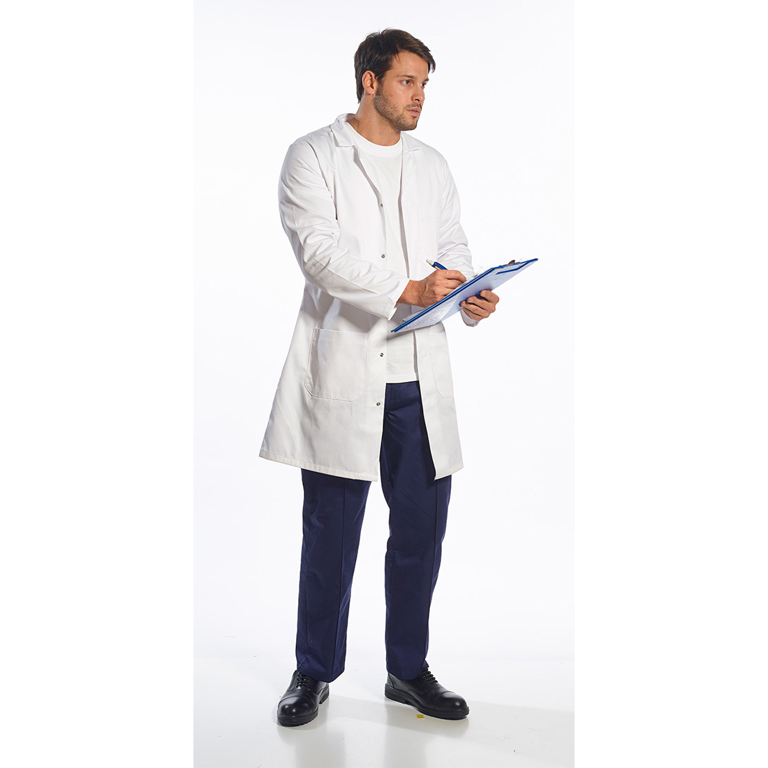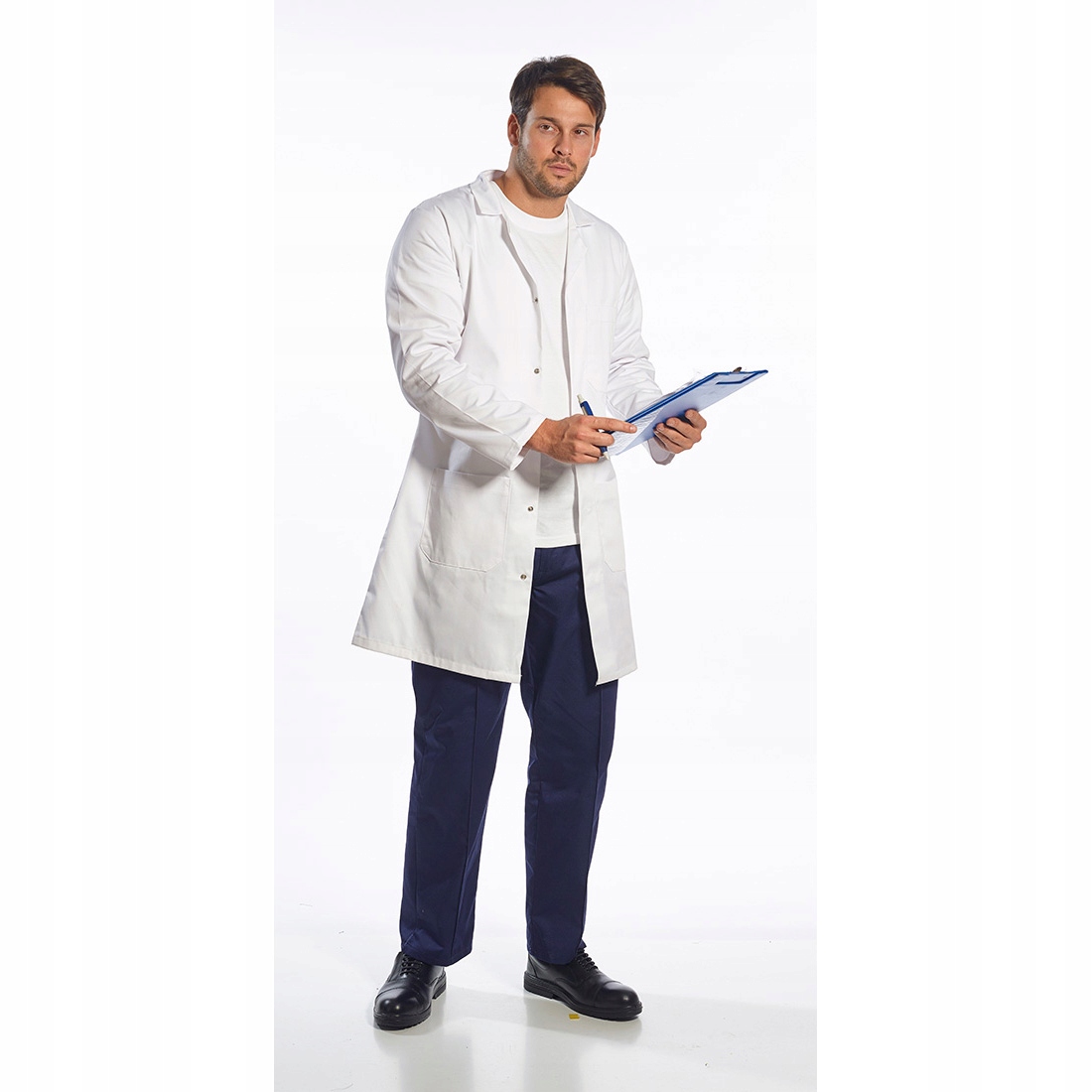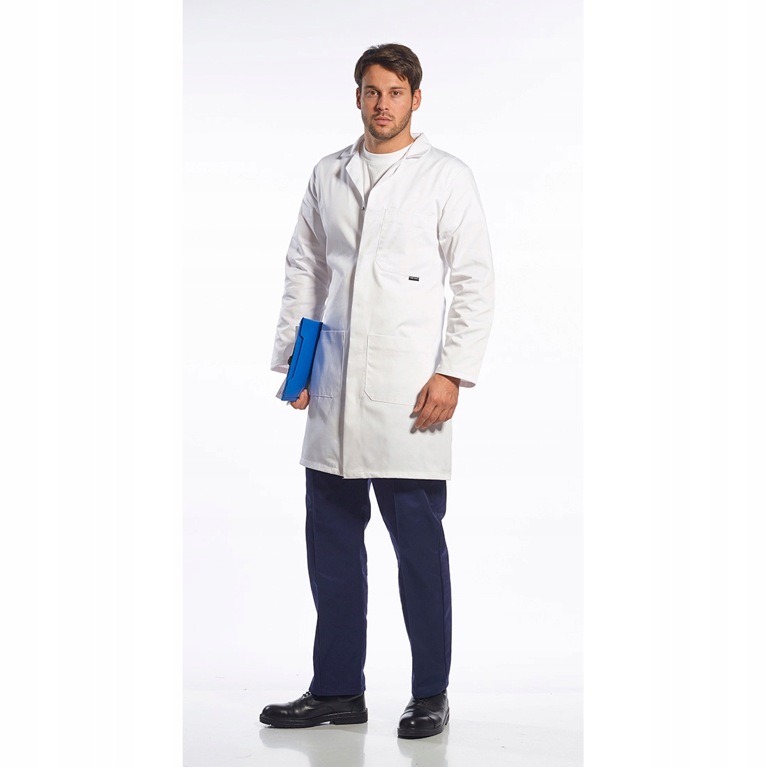Фартух призначений для лабораторних робіт. Застібається на застібки, заховані під планкою. Має дві просторі бічні кишені та нагрудну кишеню. Він повністю зменшився. Не змінює колір навіть після багаторазового прання.