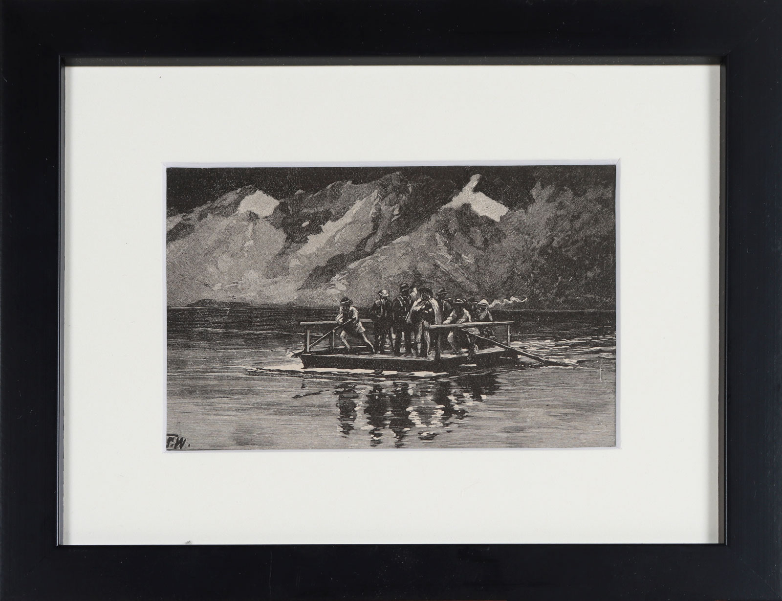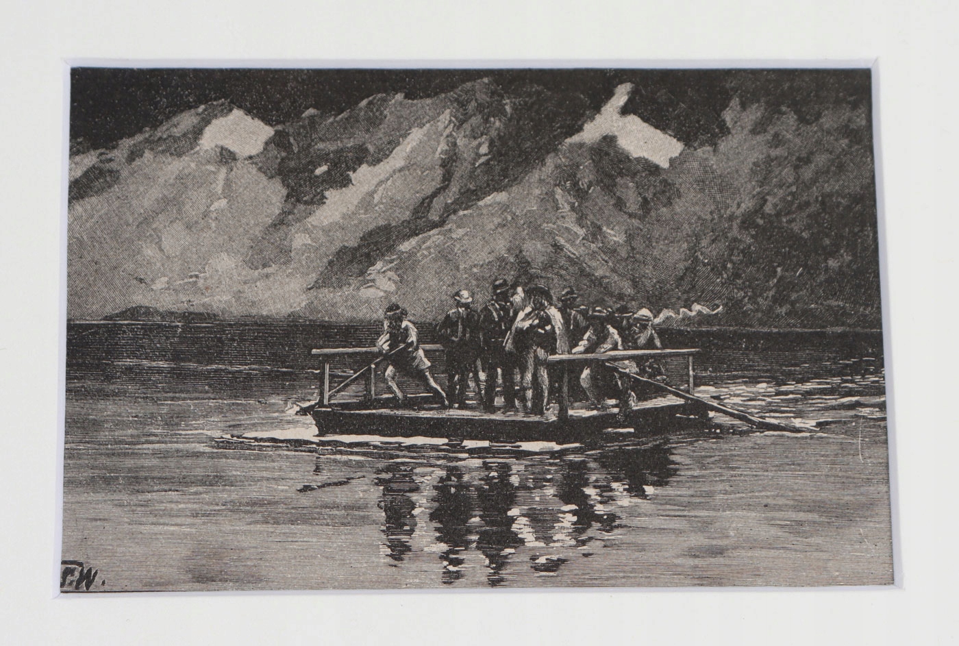 Графіка із зображенням горян на плоту, які переправляють туристів через річку.