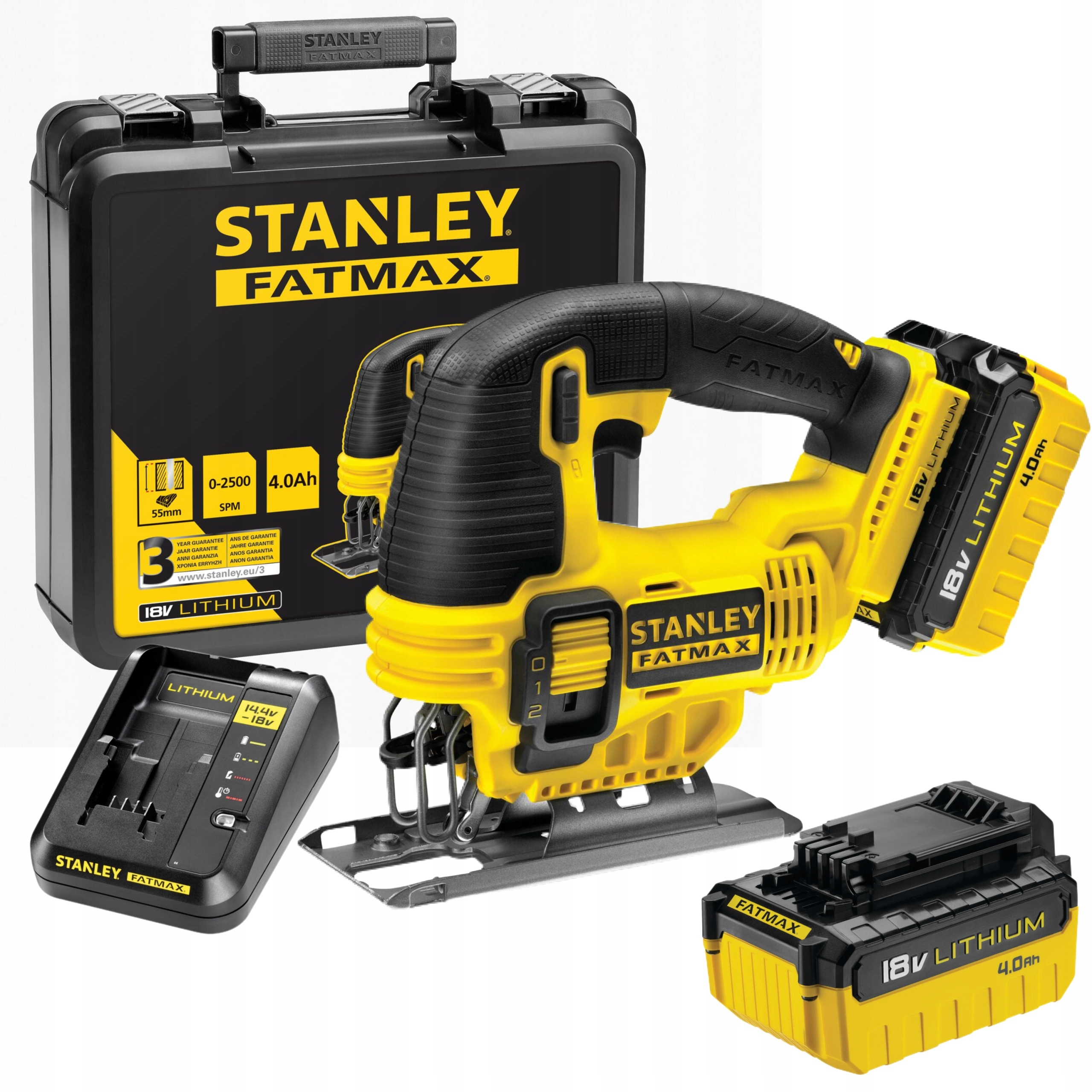 - Лобзик Stanley FatMax напругою 18 В, живиться від двох Li-Ion акумуляторів ємністю 4,0 А·год